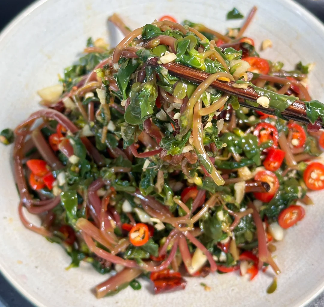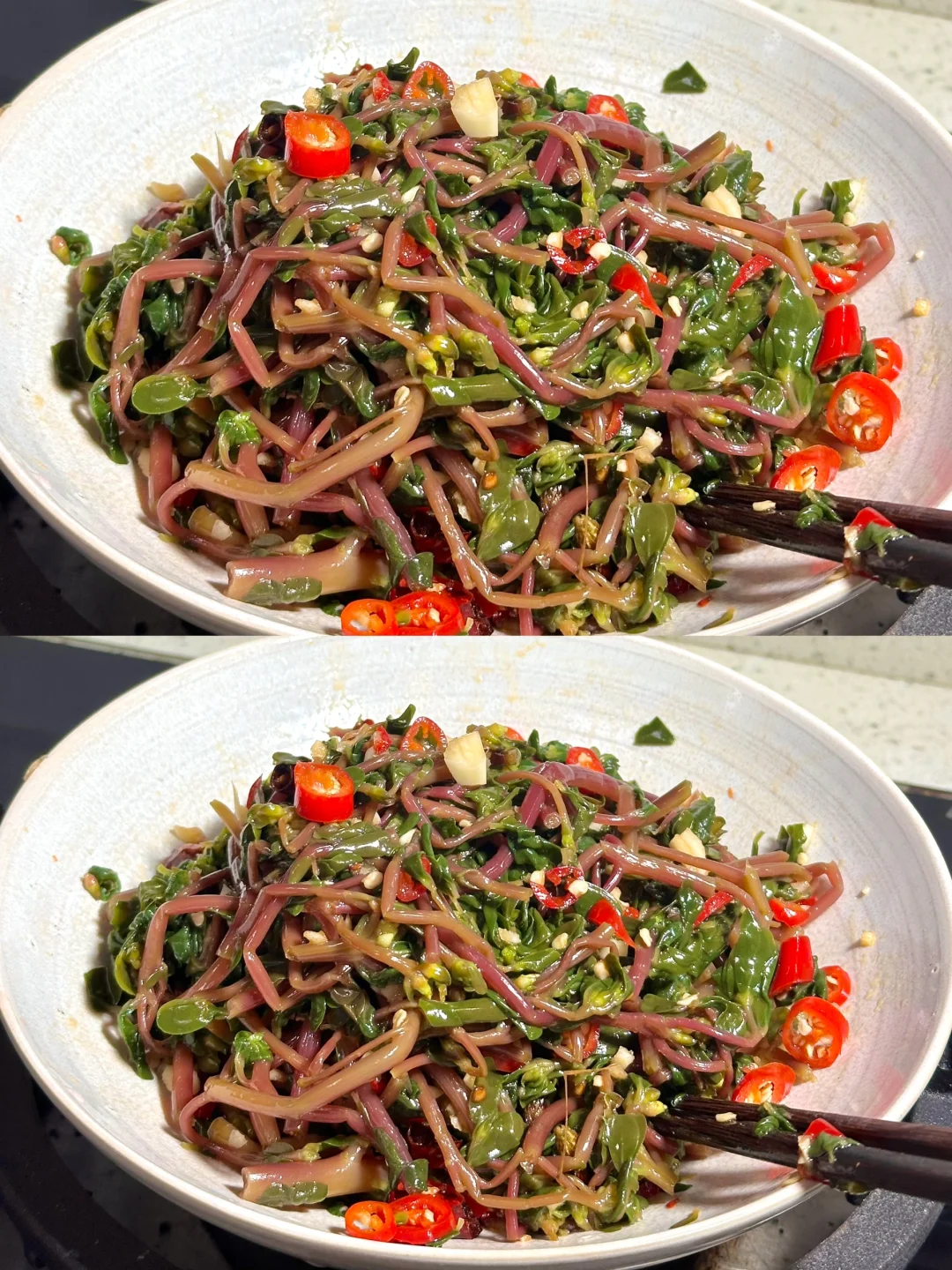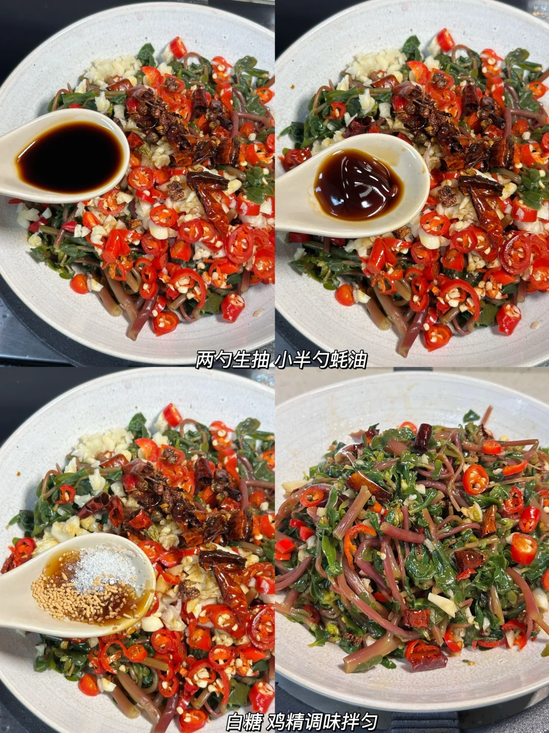 2️⃣:倒蒜末 小米椒 ,锅里重新倒一点油 放干辣椒 花椒(卤牛腱子剩下的辣椒包 不浪费[大笑R])小火炒香炒出辣味 ,倒进碗里。调味放两勺生抽,半勺蚝油,白糖 鸡精拌匀就可以开吃啦~因为马齿苋本身口感就带点酸 就没有另外再加醋了。