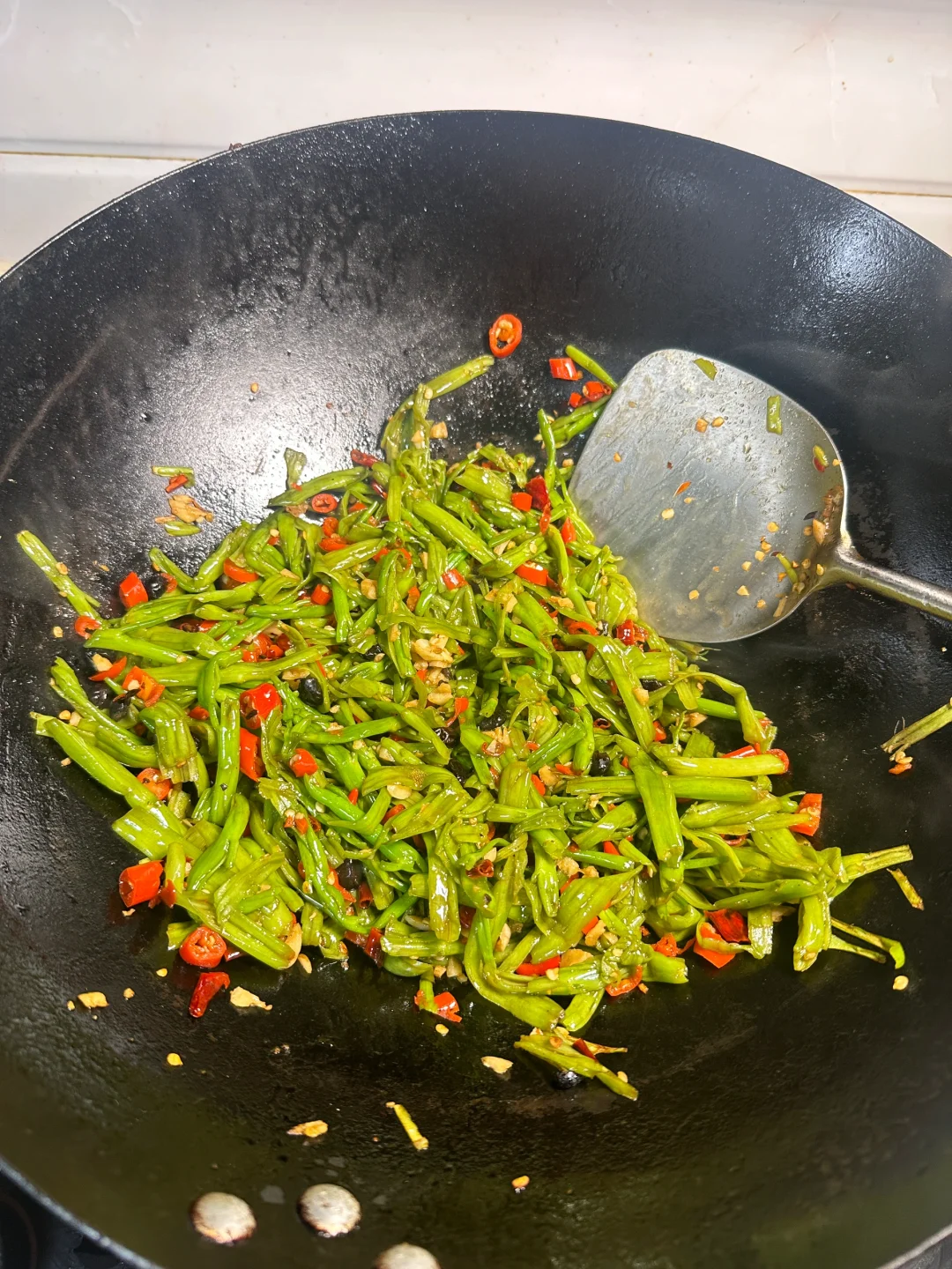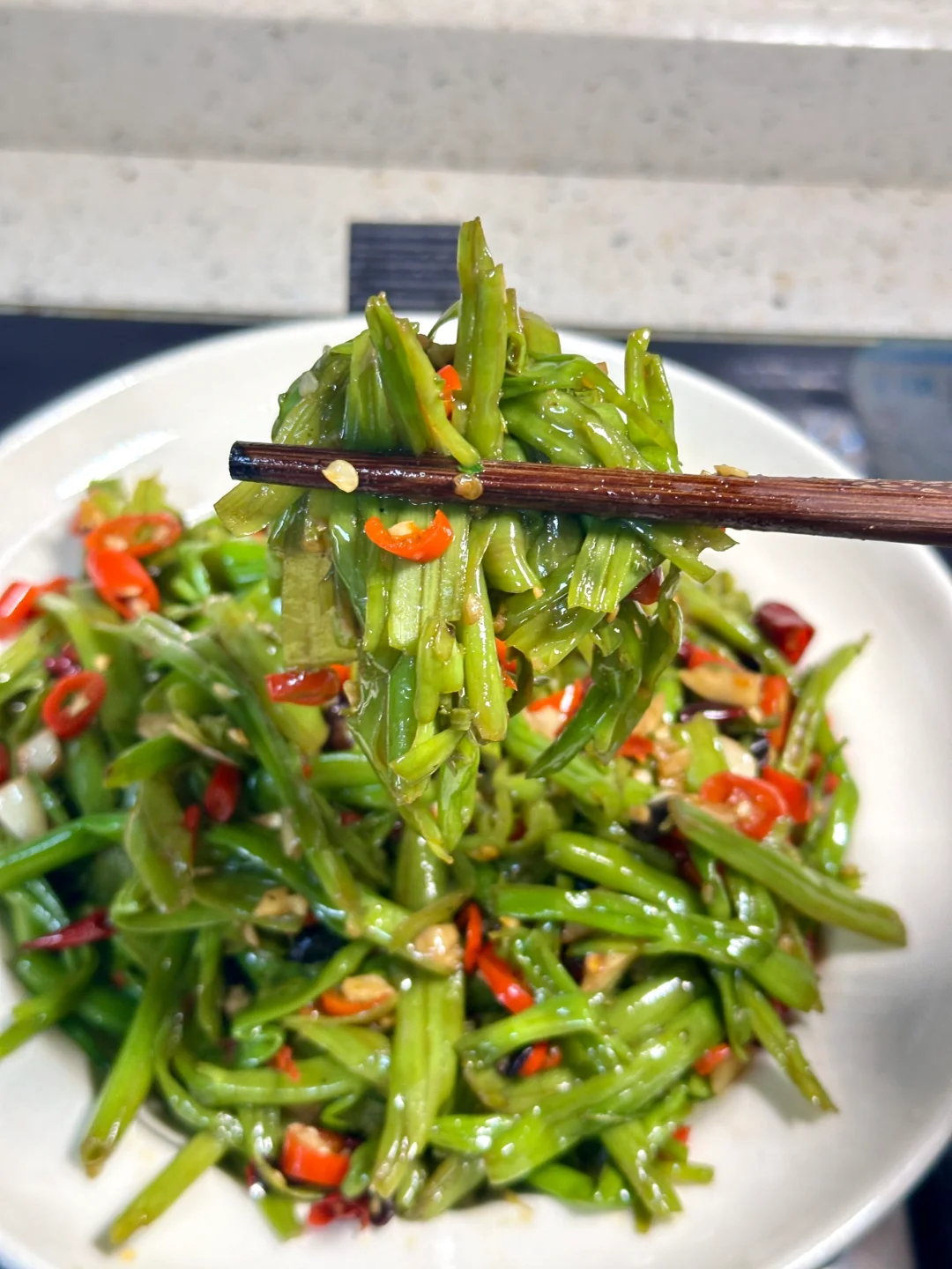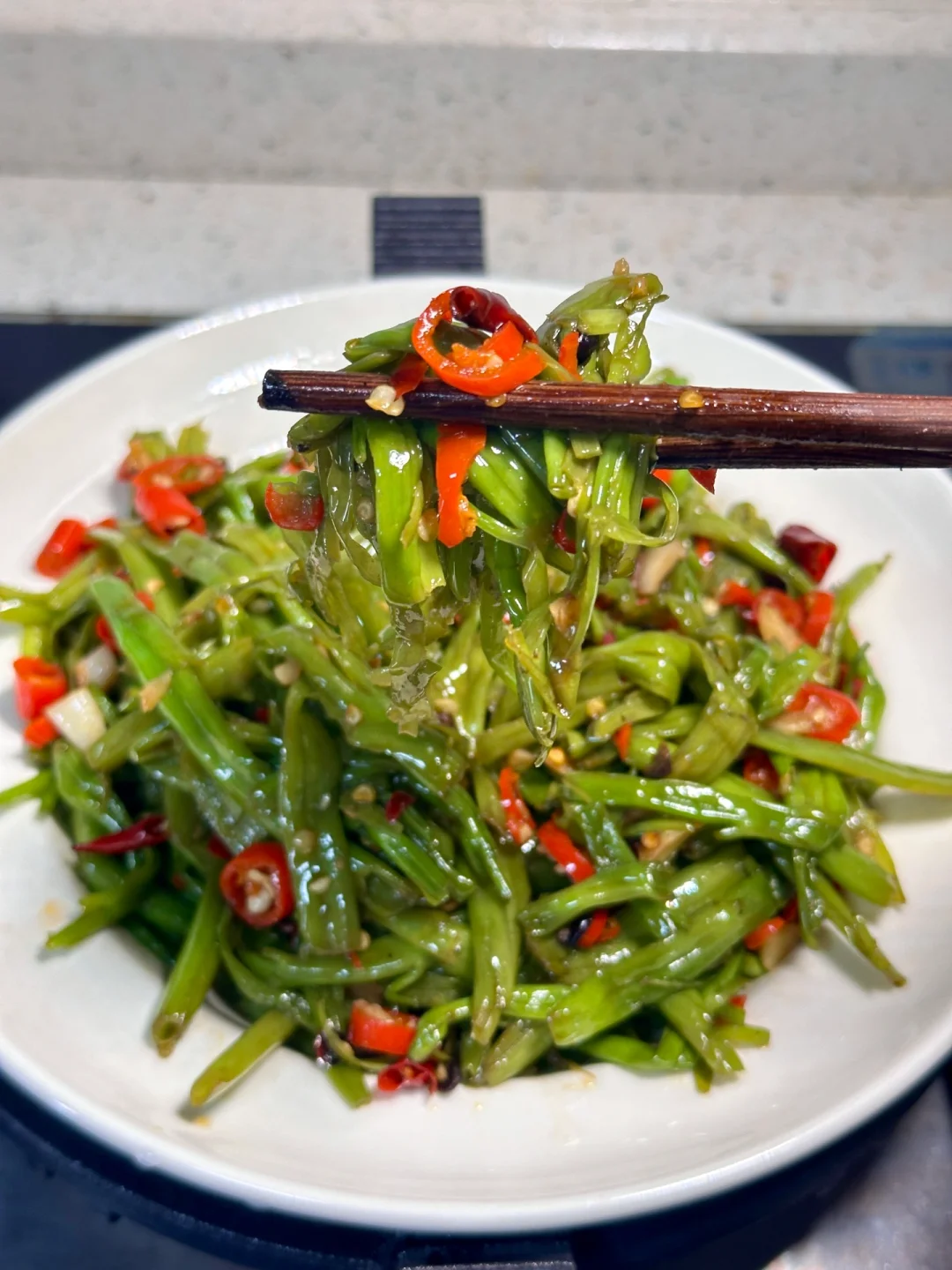 唯一的缺点就是太费米饭了🍚 香香辣辣,酸辣空心菜梗 这一碗队友说可以下四碗饭[大笑R] ✨食材:空心菜梗 蒜末 干辣椒碎 小米椒碎 豆豉 1️⃣:配菜全部切好备用,豆豉用水泡一会儿。空心菜用手捏扁再掐断,加盐抓一会,变软出水后用清水冲洗干净 攥干水份备用。热锅热油(我放的猪油)所有配料炒香,再放空心菜梗翻炒几下。 2️⃣:调味放半勺蚝油 生抽 鸡精大火炒匀。再沿着锅边到一点香醋炝锅。 炎热的夏天太适合了 超级开胃🤤 好好吃饭呀🤘🏻