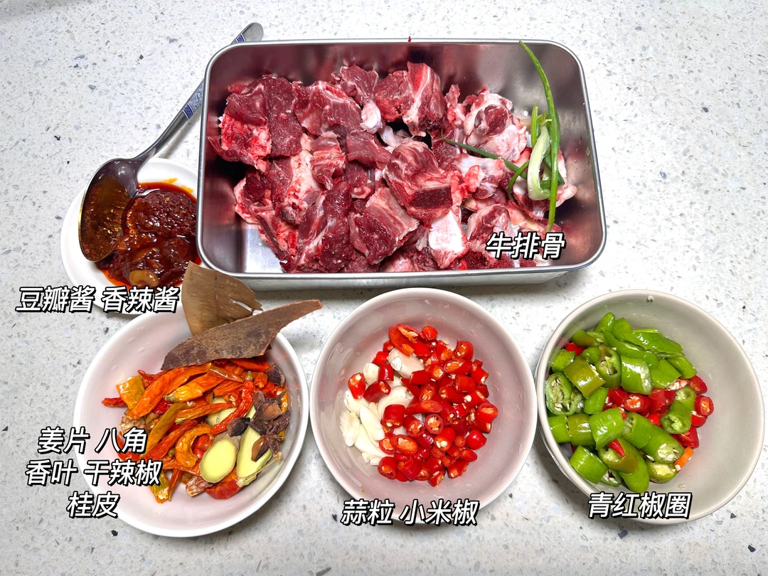 ✨食材:牛排骨 姜🫚 蒜 干辣椒 桂皮 八角 香叶 小米椒 青椒 豆瓣酱 香辣酱