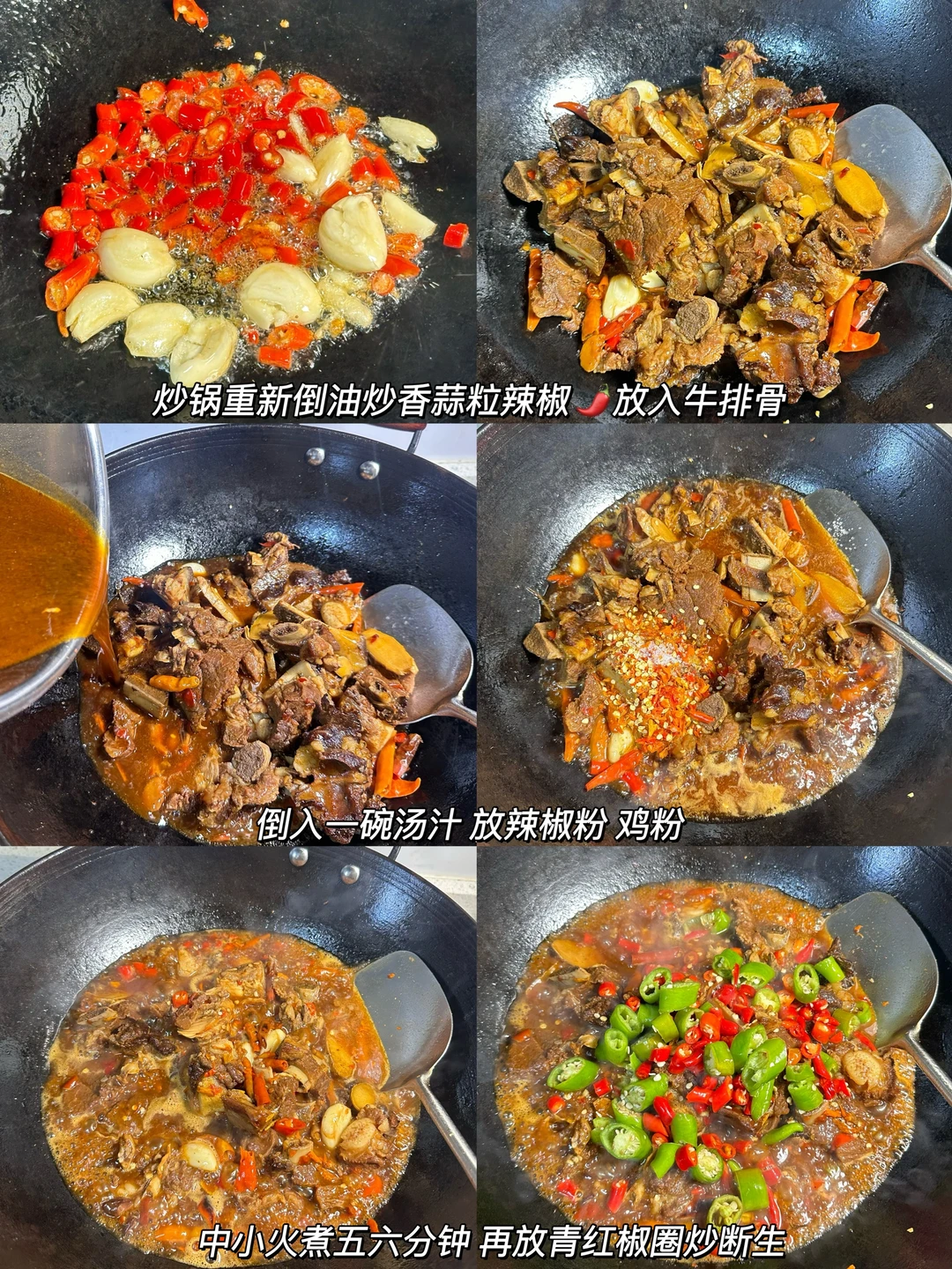 3️⃣:热锅热油炒香蒜粒 小米椒放入压好的牛排骨,再倒一碗刚才压牛排的汤 加两大勺辣椒粉 一点鸡粉煮个五六分钟