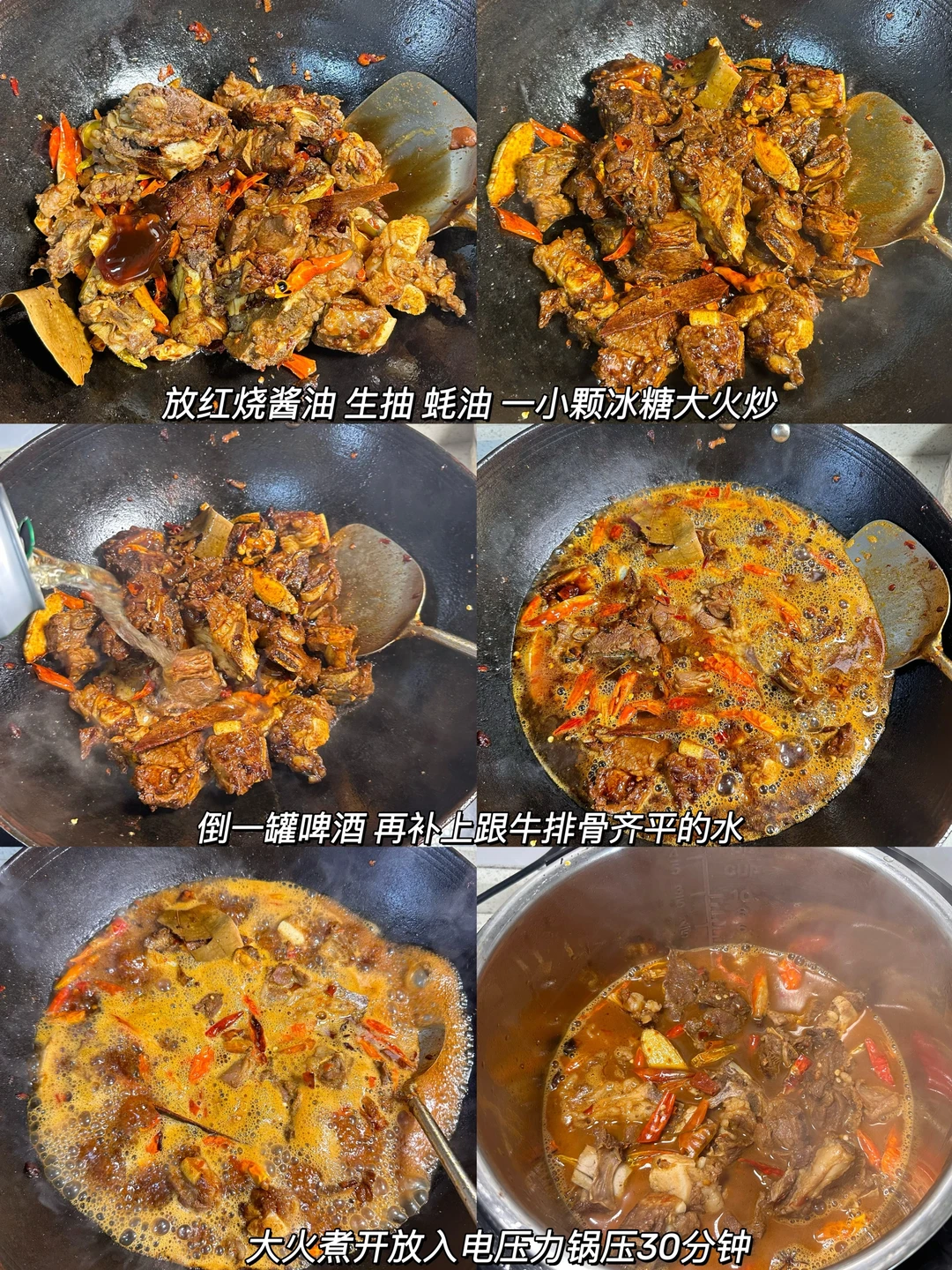 2️⃣:调味放一小勺红烧酱油 生抽 蚝油 一颗冰糖炒出酱香味。放一罐啤酒 再补上跟牛排齐平的热水大火煮开后转入电压力锅煮30分钟(根据自家锅来 明火用的高压锅缩短一半时间)