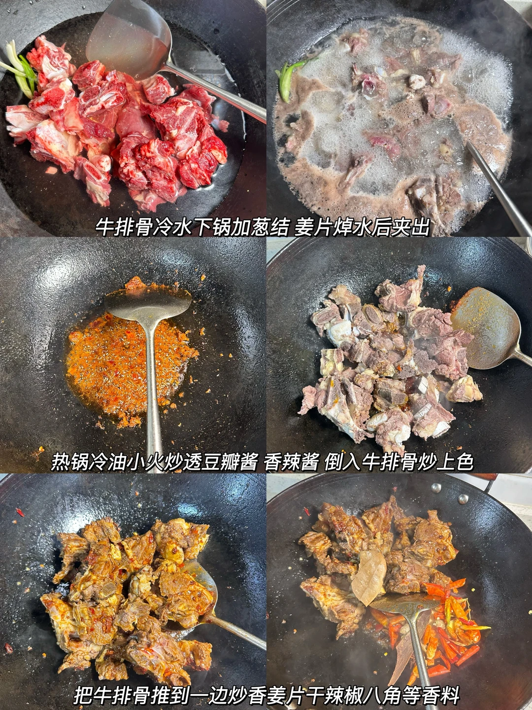 1️⃣:牛排买回来洗干净冷水下锅加葱结 姜片冷水下锅焯水后夹出来。把所有配料准备好。热锅冷油小火放豆瓣酱 香辣酱炒透,倒牛排骨炒上色,把牛排推到一边,炒香姜片干辣椒 桂皮 八角 香叶。