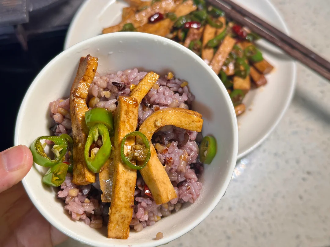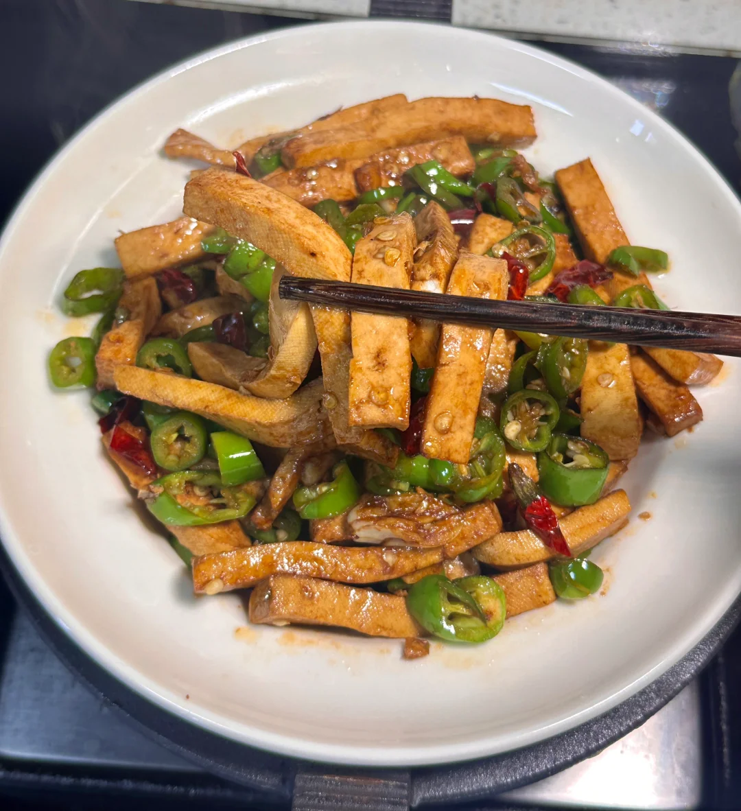 两块钱豆干炒了一盘[赞R][赞R]青椒又嫩又辣~超级下饭 ✨食材:香干 青椒 蒜 干辣椒 1️⃣:香干切均匀的片,青椒切圈备用。锅里倒油烧热(猪油更香)放香干炒几下变软,推到一边爆香蒜末干辣椒 炒匀后调味放一锅铲生抽 一点酱油 蚝油大火炒香。 2️⃣:再放青椒圈炒几下,加鸡精调味炒匀就可以啦。 最近超市卖的高安椒又便宜又嫩[大笑R][大笑R] 好好吃饭呀🤘🏻
