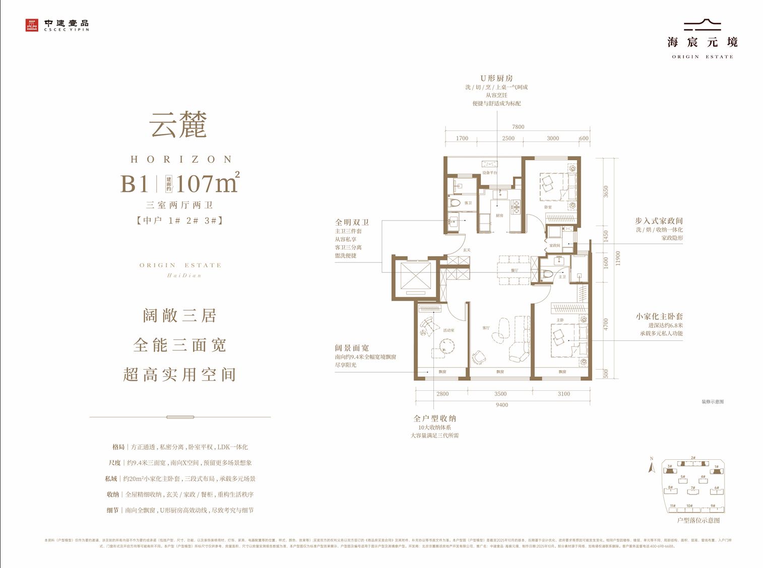 107平方米B1三居堪称三口之家的全周期理想居所,户型方正通透。约9.4米南向三面宽搭配可拓展的南向X空间,为生活场景预留更多想象;约20平方米小家化主卧套采用三段式布局,承载多元场景;全屋精细化收纳系统(玄关柜、家政区、餐边柜)重构空间秩序;U形厨房优化操作动线,南向全飘窗增添生活质感。其端户版本更配备约10米超长转角飘窗,L形大采光面实现270°无遮挡观景,兼具实用与颜值。