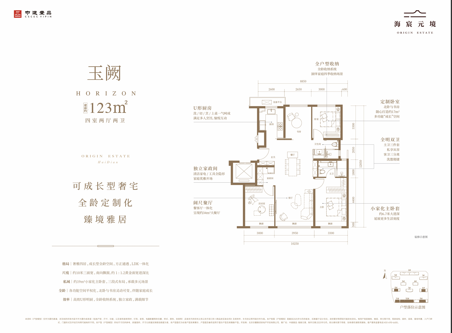 123平方米四居两卫,八窗全明户型,南向三面宽拓展至约10.25米,每面宽均配飘窗;3.95米面宽客厅与餐厅同宽,空间开阔大气。南向主卧套房自带步入式衣帽间与独立卫浴,入户玄关与独立家政间提升生活便捷度;北向则规划U形厨房、书房、次卧及三分离客卫,功能分区科学合理。