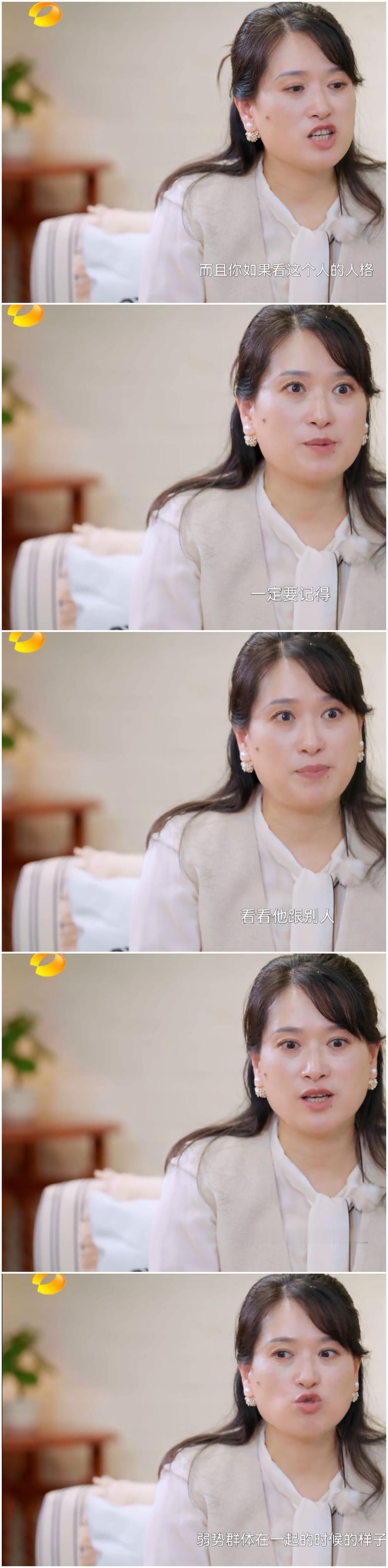 李雪琴的感情困惑, 咨询张泉灵及沈奕斐 的解答。 李雪琴觉得“不要相信爱情, 要相信人格, 当爱情消失的时候, 他仍然是一个善良的好人, 如果这个人的人格是好的, 至少不会遍体鳞伤”。 张泉灵和沈奕斐都同意她的观点, 沈奕斐强调要判断一个的人格 要注意观察他对待弱势群体 或者陌生人的样。 而张泉灵则主张要观察他除了大麻烦 及伤害到他切身利益时的样子。 沈奕斐坦言夫妻就是一对生命合伙人, 要一起去“升级打怪”的, 如果在“战斗”的过程中, 还有提防身边的“战友”是否会给自己捅刀子, 整天提心吊胆的过日子 那么就没法活了。 是呀, 如果夫妻双方的婚姻走到尽头, 对方的人品太差, 那么离婚都会离得人尽皆知, 各种“捅刀子”, 难以体面收场。 那将是一生的痛呀。 我们都看到过太多不堪的离婚收场方式, 根源都是对方的人品不好。