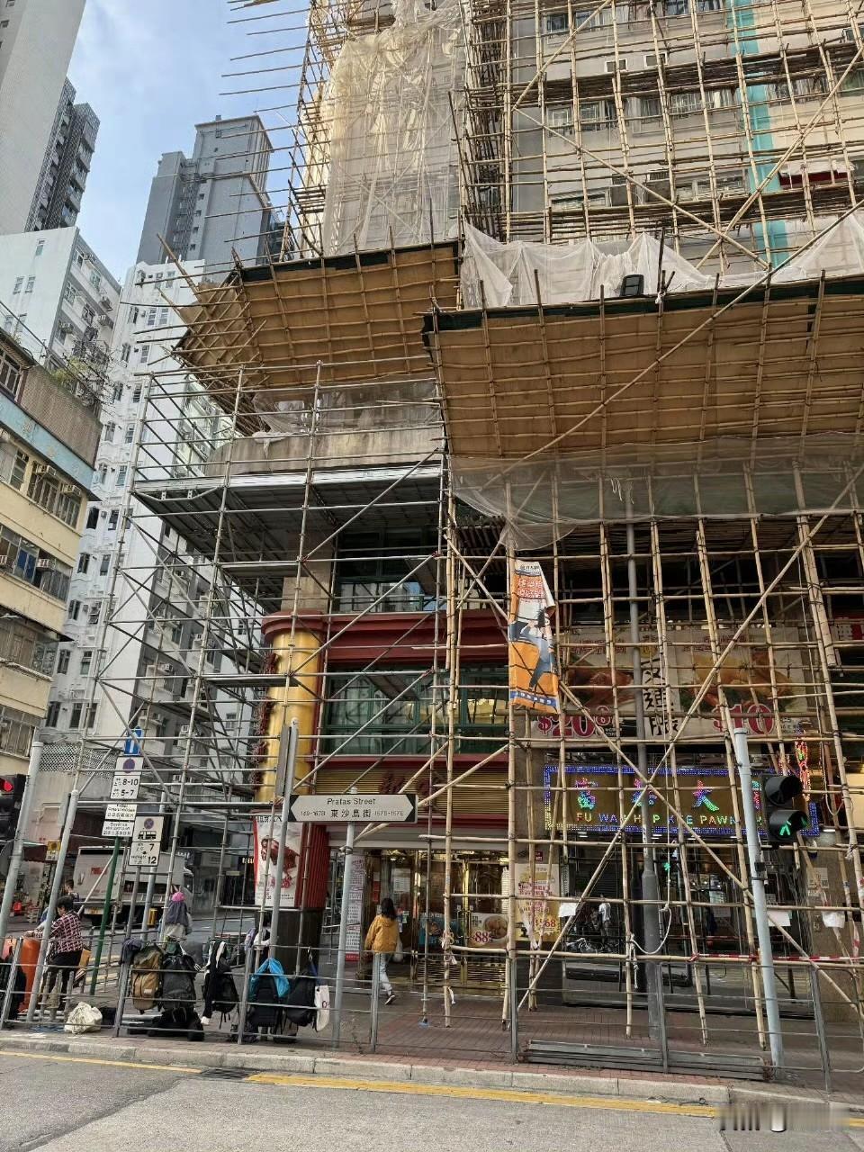 香港竹棚:留还是走,是个问题。这个竹子脚手架的人工费贵很多,因为效率很低,内地脚