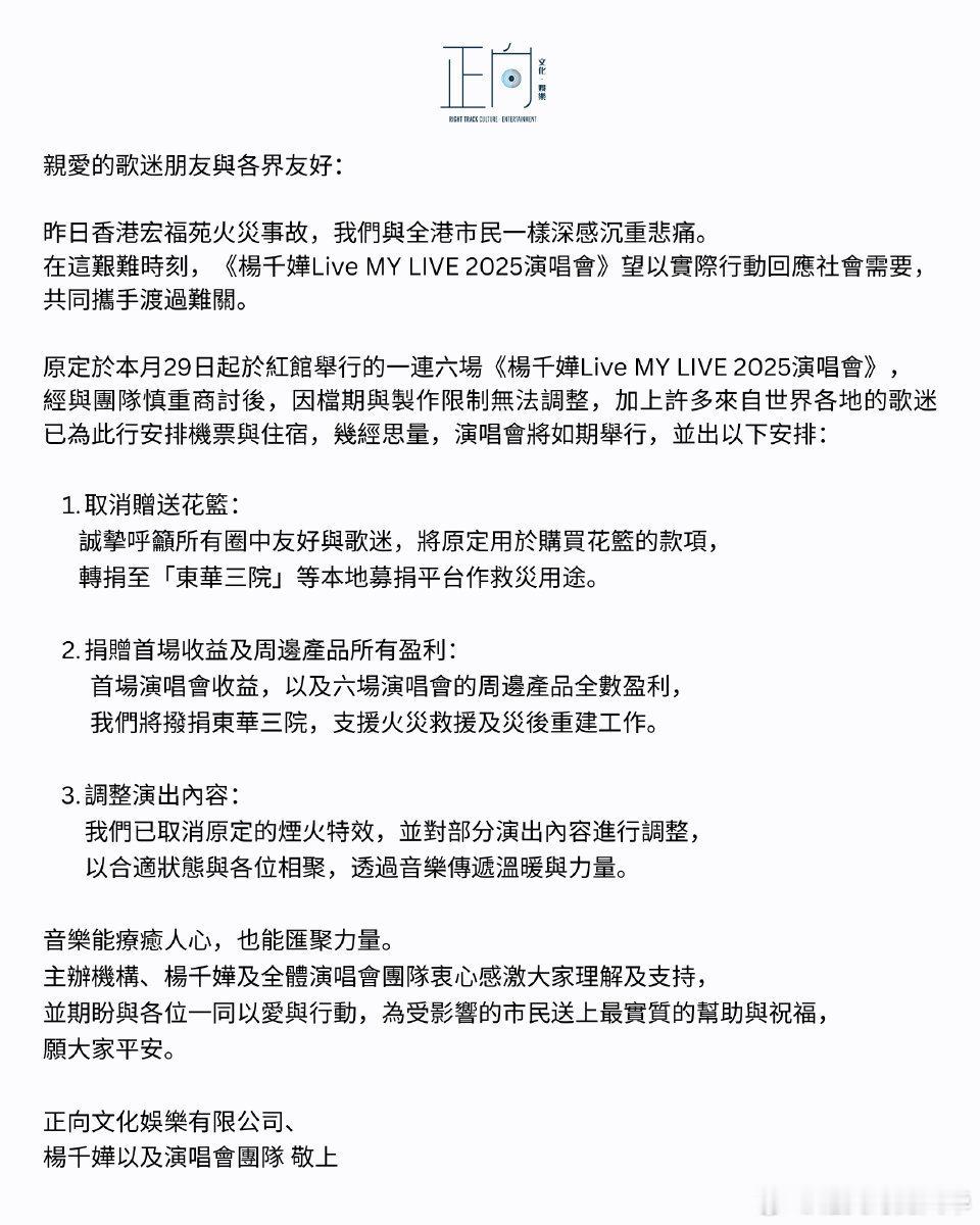 杨千嬅把紫发染黑了 出道30周年演唱会满是心意!杨千嬅染黑标志性紫发,以黑衣配黑发致哀,捐200万支援受灾家庭,唱遍《少女的祈祷》等经典,用“陪伴是力量”的告白,让红馆变成疗愈现场。