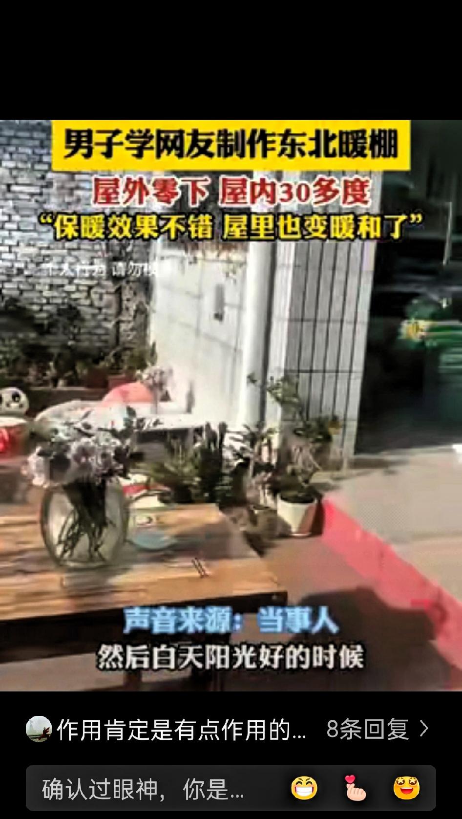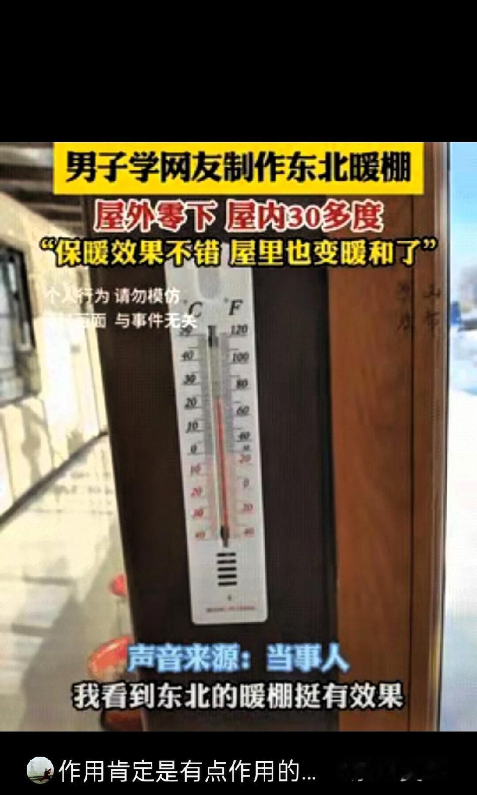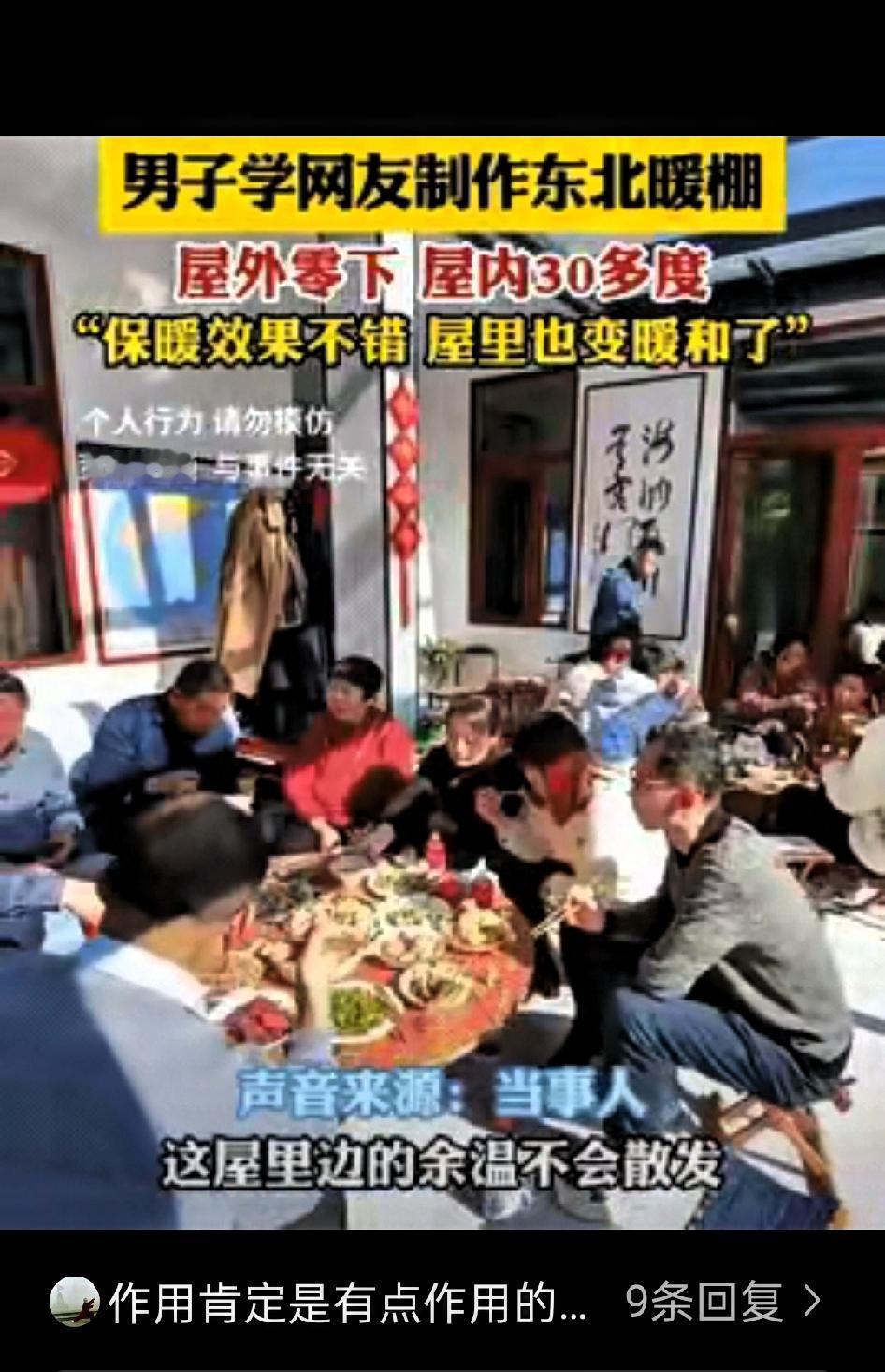 “太有头脑了”!河北石家庄,男子为了省钱应对零下天气,竟然花1000多,学网友制作东北暖棚,解决了冬天取暖的大问题,不光省了钱,还让家里老人舒舒服服的,这份心思比啥都实在。 一入冬,石家庄气温就降到零下,风一吹特别冷。大哥家的老人年纪大了,很怕冷,但又舍不得开空调,总说电费太贵;烧煤气取暖,又担心不安全,晚上睡不踏实。 大哥看在眼里,没像有些年轻人那样,觉得老人“固执”“不听话”,也没和老人争执,就是琢磨着怎么能找个既省钱又安全的取暖办法。 后来他在网上刷到东北人搭阳光暖棚的视频,看到人家靠暖棚取暖,不用电不用煤,棚里温度也够用,就想着试试。他买了材料,找朋友帮忙,花了一个下午就把暖棚搭好了,刚好罩住自家朝南的房子。 搭好第二天,太阳一出来效果就很明显。棚里晒得暖暖的,温度能到38度左右,连带着屋里的温度也升上来,能稳定在22度上下。老人在屋里不用穿厚棉衣,穿件薄毛衣就行,坐在窗边晒太阳,心情也很好。 到了晚上,他就在暖棚外面盖一层旧棉被保温,第二天早上棚里温度还能有十七八度,不用一早起来就面对刺骨的冷。老人笑着说,以后电热毯都用不上了。一开始邻居路过,还觉得他瞎折腾,花这钱不值,后来看到暖棚好用,都过来问怎么搭、花了多少钱。 这1000多块钱花得挺值,塑料布就算坏了,换一块也就几十块,比每个月几百上千的空调费、煤气费省多了。 网友说该向南方推广,其实最该学的不是暖棚本身,而是大哥解决问题的方式——他没想着改变老人的习惯,而是顺着老人的想法,用简单的办法改善了生活环境。 很多时候,家里的小问题,不用非得较真或者抱怨,静下心来想办法,往往能找到既实用又省钱的路子
