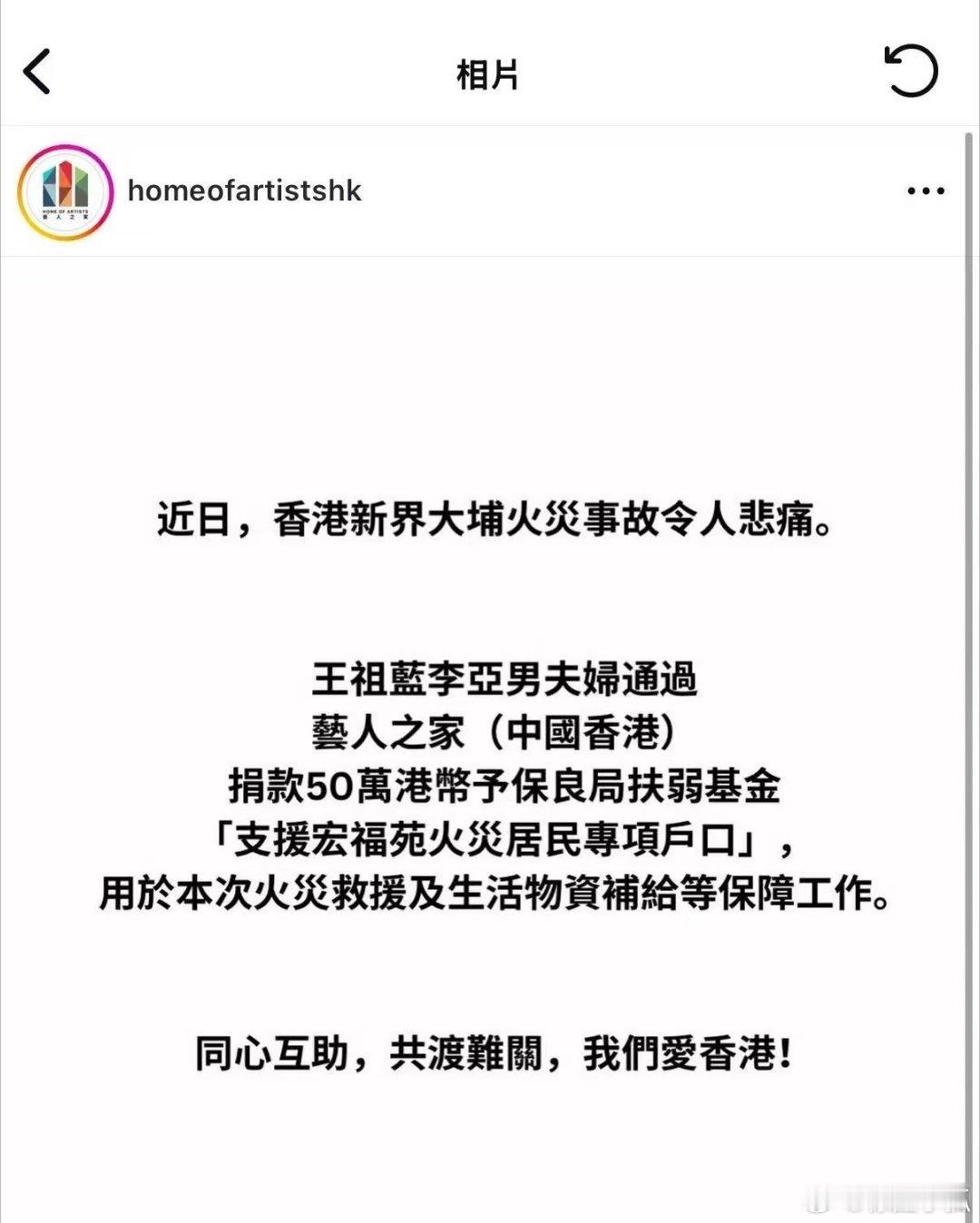 香港火灾发生地在王祖蓝家附近香 港大埔宏福苑火灾牵动人心,那些焦灼画面让人不忍卒睹。但危难之中,暖流从未缺席:王祖蓝李亚男夫妇捐出50万港币驰援,无数义工奔波忙碌,各界物资与爱心源源不断。
