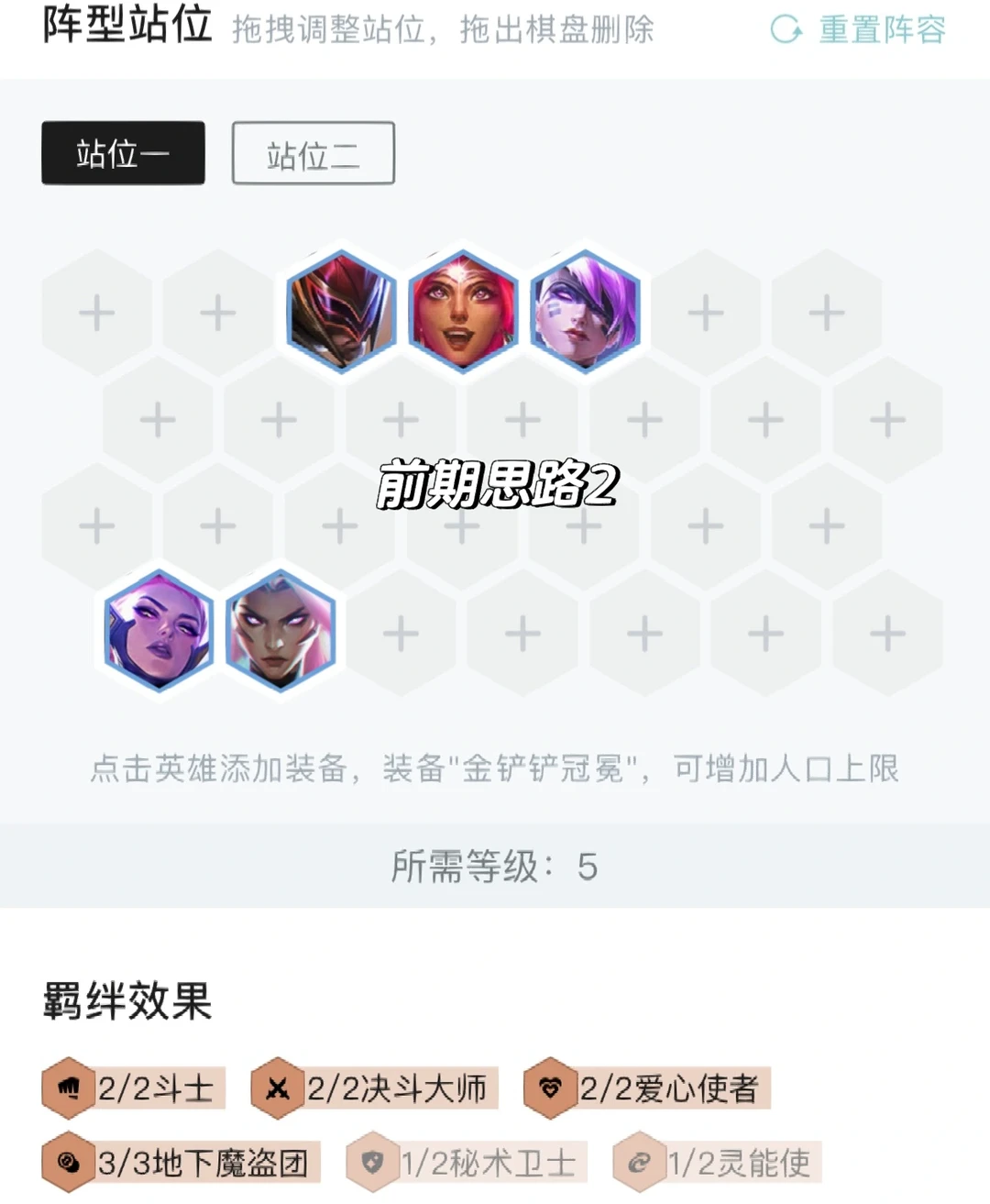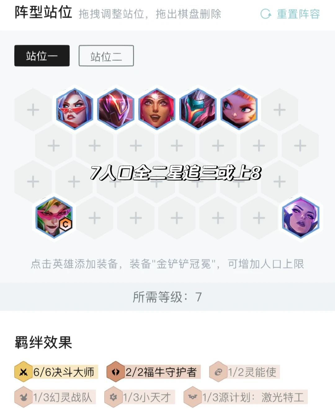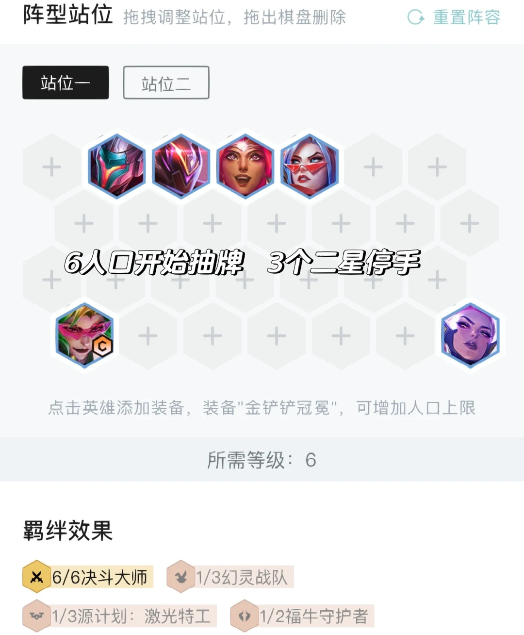 正常节奏2-1拉4,2-4拉5,3-2拉6抽牌,4-5个二星停手,不要心疼经济,3阶段存钱吃连败等于送死。4阶段有决斗心的情况下,三费及以下全二星先上8再追三星,没有就直接7人口追三星。