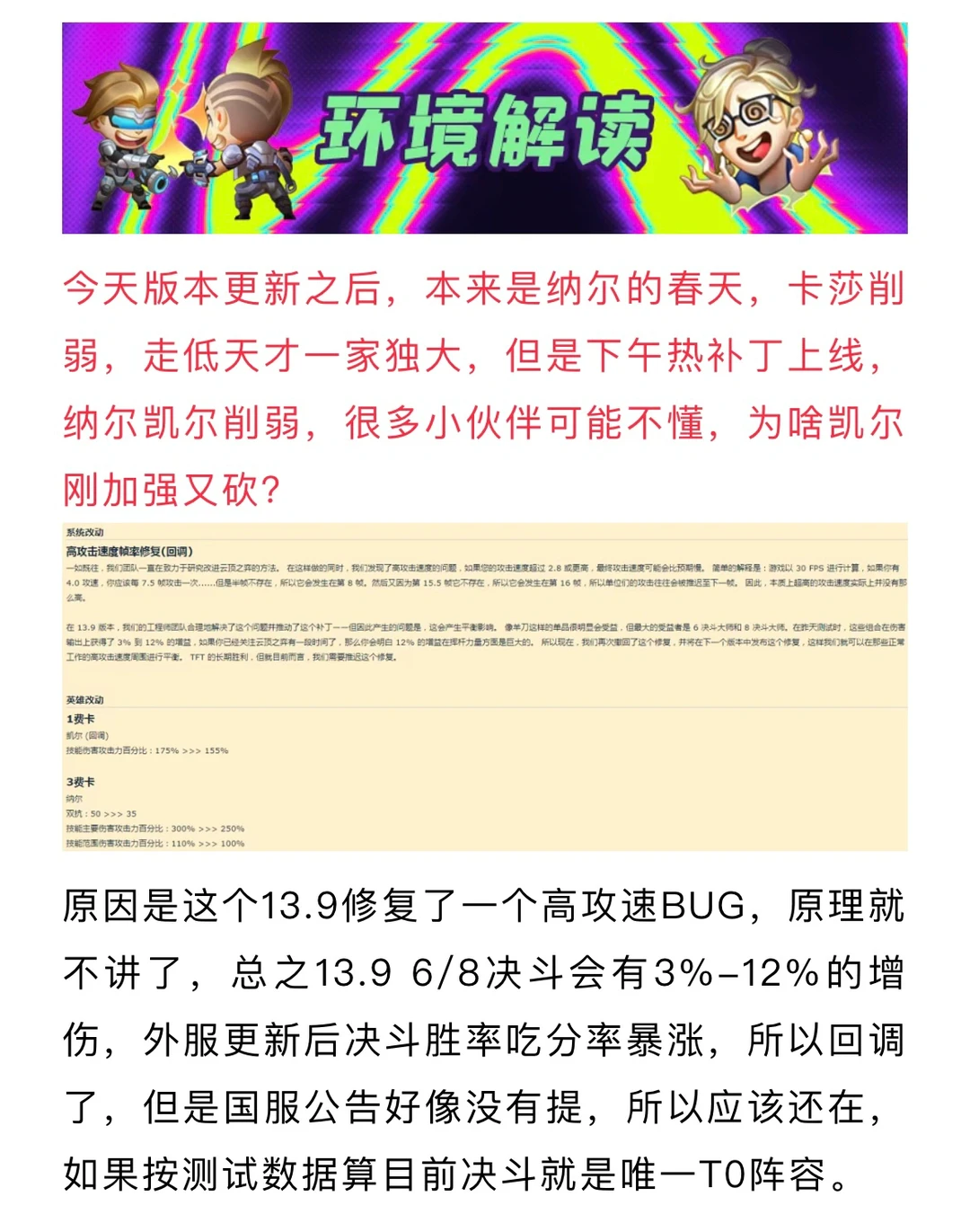 [汗颜R]原因是这个13.9修复了一个高攻速BUG,原理就不讲了,总之13.9 6/8决斗会有3%-12%的增伤,外服更新后决斗胜率吃分率暴涨,所以回调了,但是国服公告好像没有提,所以应该还在,如果按测试数据算目前决斗就是唯一T0阵容。