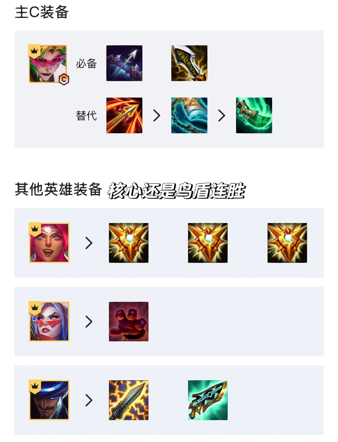 2、鸟盾是决斗核心装备,有大棒和锁子甲散件选秀一定优先于主C装备。