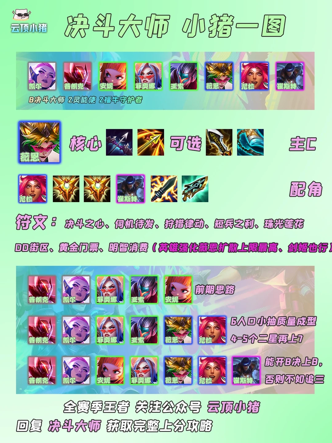 决斗最关键的就是节奏,3阶段做到全场最强战力基本就有分,后面上限在于有几个三星,而且这个版本决斗环境是不错的,同节奏阵容里没有毒瘤卡莎,纳尔也削弱了。