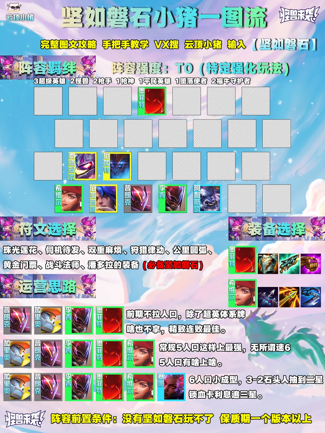 前期不拉人口精致连败最好,3-2可以大抽一波,把石头人抽到二星,其他基础牌过半数二星就行,然后三阶段装备对能无脑吃连胜进野,卡利息慢追出三星石头人和其他超英体系牌。