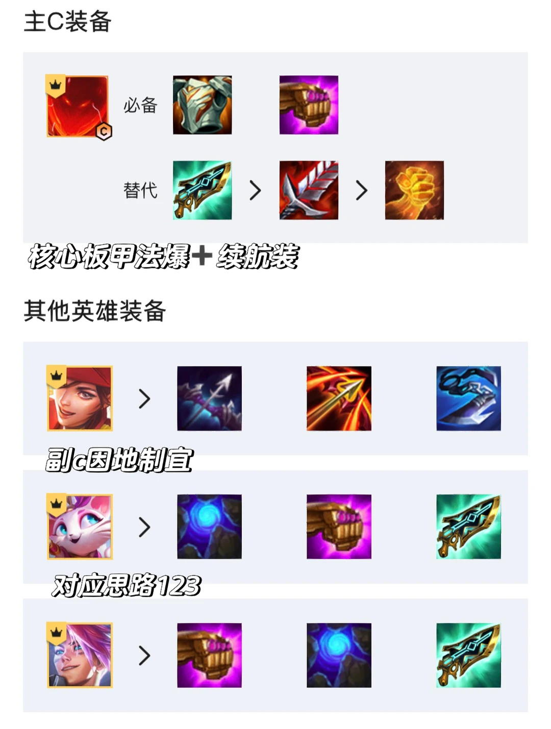 [氛围感R]装备思路:主C石头人核心装备板甲、法爆、第三件固定补续航装科技枪饮血剑正义之拳都行。