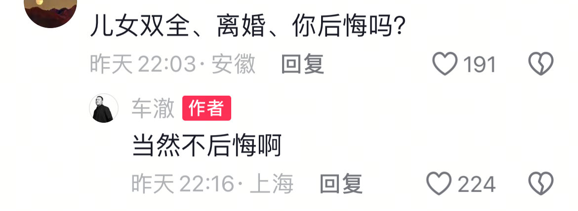 车澈回应与李嘉格离婚车澈不后悔与李嘉格离婚 11月29日,车澈评论区回应与李嘉格离婚,并称不后悔,如果时间倒回还会离婚,引发热议。网友:“儿女双全、离婚、你后悔吗?”车澈:“不后悔啊”。网友:“如果时间倒回你还会离婚吗?”车澈:“会”。