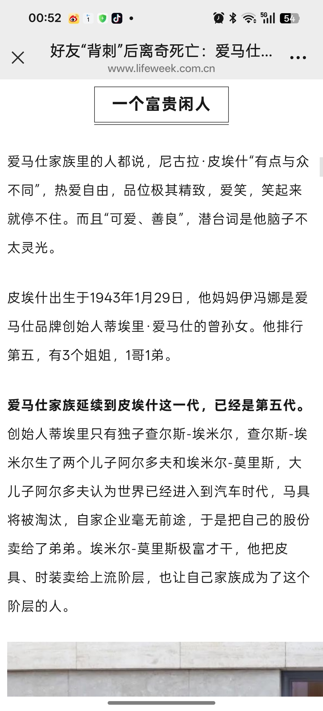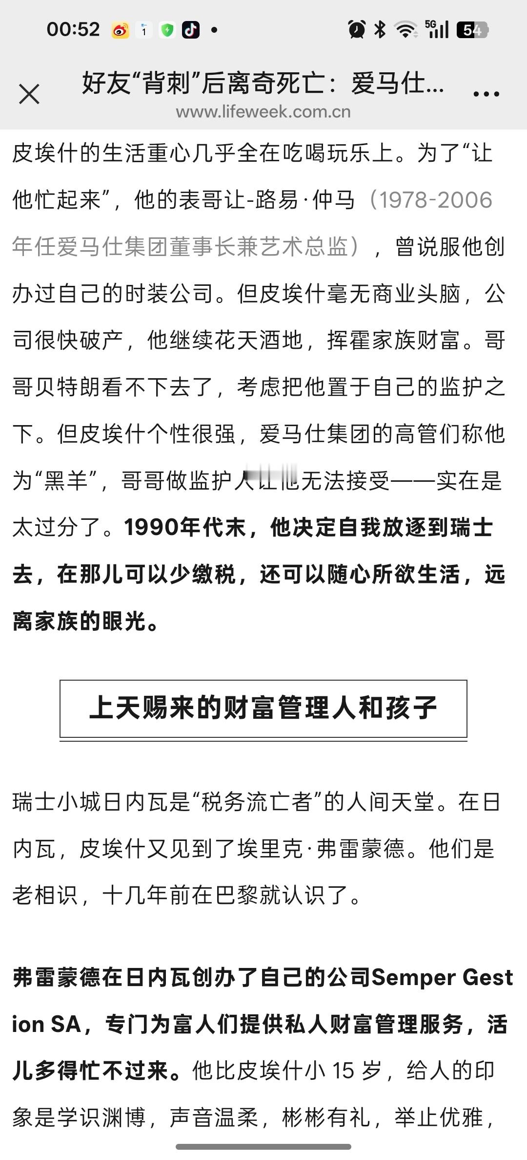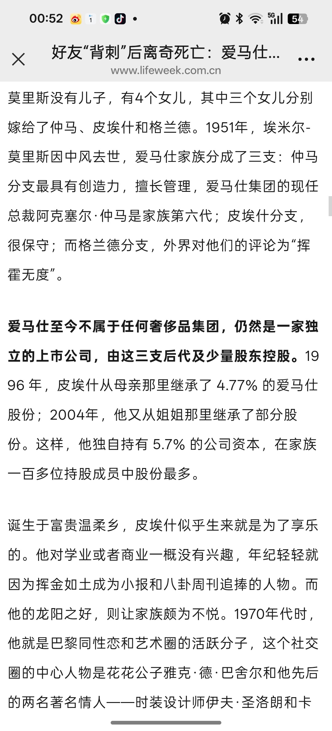 爱马仕继承人被25年财管好友骗光财产 周日中午用短暂的午休时间稍微关注了一下爱马仕继承人的新闻(见我之前那篇) 同时和朋友发了个消息,这个爱马仕继承人像是丙午时(我自己估计的)。晚上遇到朋友,一起吃饭,朋友也认为像,并且有比较强的同性恋倾向。晚上回到家翻了下其他媒体报道,果然有。---------------------诞生于富贵温柔乡,皮埃什似乎生来就是为了享乐的。他对学业或者商业一概没有兴趣,年纪轻轻就因为挥金如土成为小报和八卦周刊追捧的人物。而他的龙阳之好,则让家族颇为不悦。1970年代时,他就是巴黎同性恋和艺术圈的活跃分子,这个社交圈的中心人物是花花公子雅克·德·巴舍尔和他先后的两名著名情人——时装设计师伊夫·圣洛朗和卡尔·拉格斐。皮埃什的生活重心几乎全在吃喝玩乐上。为了“让他忙起来”,他的表哥让-路易·仲马(1978-2006年任爱马仕集团董事长兼艺术总监),曾说服他创办过自己的时装公司。但皮埃什毫无商业头脑,公司很快破产,他继续花天酒地,挥霍家族财富。哥哥贝特朗看不下去了,考虑把他置于自己的监护之下。但皮埃什个性很强,爱马仕集团的高管们称他为“黑羊”,哥哥做监护人让他无法接受——实在是太过分了。1990年代末,他决定自我放逐到瑞士去,在那儿可以少缴税,还可以随心所欲生活,远离家族的眼光。1992年,塞维利亚举办世博会,他去视察工地时,偶然遇到了一个年轻的摩洛哥石匠贾迪尔·布特拉克(Jadil Butrak)。贾迪尔刚刚20岁,身材瘦高,目不识丁,皮埃什对他产生了浓厚兴趣,决定“教育”他。这个年轻人很快成为皮埃什离不开的贴身仆从,传出来的流言说他每晚睡在皮埃什的床脚。没事儿时他雕刻石雕,后来成了园丁。起初,他在餐桌上为皮埃什的宾客服务,沉稳、恭敬,把精美的瓷餐具和银刀叉摆放得那么到位,日子久了,大家开始叫他“贾迪尔”,他也堂堂正正地和皮埃什同席而坐。一位知情人说:“贾迪尔很快学会了一切,而且学得非常好,不管是举止还是谈吐。”2002年,贾迪尔告诉皮埃什,他爱上了一个西班牙吉普赛女子玛丽亚·帕兹·皮内罗(Maria Paz Pineiro)。皮埃什震惊之余接受了这一事实,并热情接纳了这个性格火辣的女郎。玛丽亚起初低调地待在厨房,随后也在餐桌边和皮埃什平起平坐,甚至主导了餐桌上的谈话。皮埃什生病了,玛丽亚会照顾他,成了这位老人的专属护士。她在家里也变得不可或缺。贾迪尔和玛丽亚在2003年、2011年生了两个孩子,皮埃什觉得上天赐给他一个家庭,称这一家四口为自己的“孩子”,很是关爱他们。他和家族几乎断了联系,只与极少数亲戚还见面。这种家庭模式在外人看来未免奇特,但皮埃什自称很幸福。2018年他过75 岁生日,在西班牙城市塞维利亚的豪宅举办奢华的庆祝派对,贾迪尔和玛丽亚与皮埃什一起招待贵宾,包括法国前文化部长,还有伊朗末代王后法拉赫,俨然家里的年轻主人。既然是“孩子”,那么父亲是无法说出“不”的。只要贾迪尔和玛丽亚提出想买他的哪块地产,皮埃什就会指示弗雷蒙德想办法促成交易。他在瑞士、西班牙和葡萄牙的54处房子、农场,一块块被这对伴侣纳入囊中。据瑞士媒体报道,这些不动产的价值超过6000万瑞士法郎(约5.3亿人民币)。根据后来的种种信息,弗雷蒙德显然早就对这对年轻的夫妻甚有微词,不过他沉住气,并未表现出来,甚至还和这“祖孙”三代一起度假。