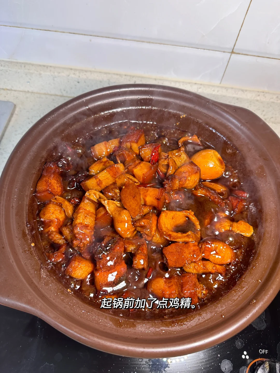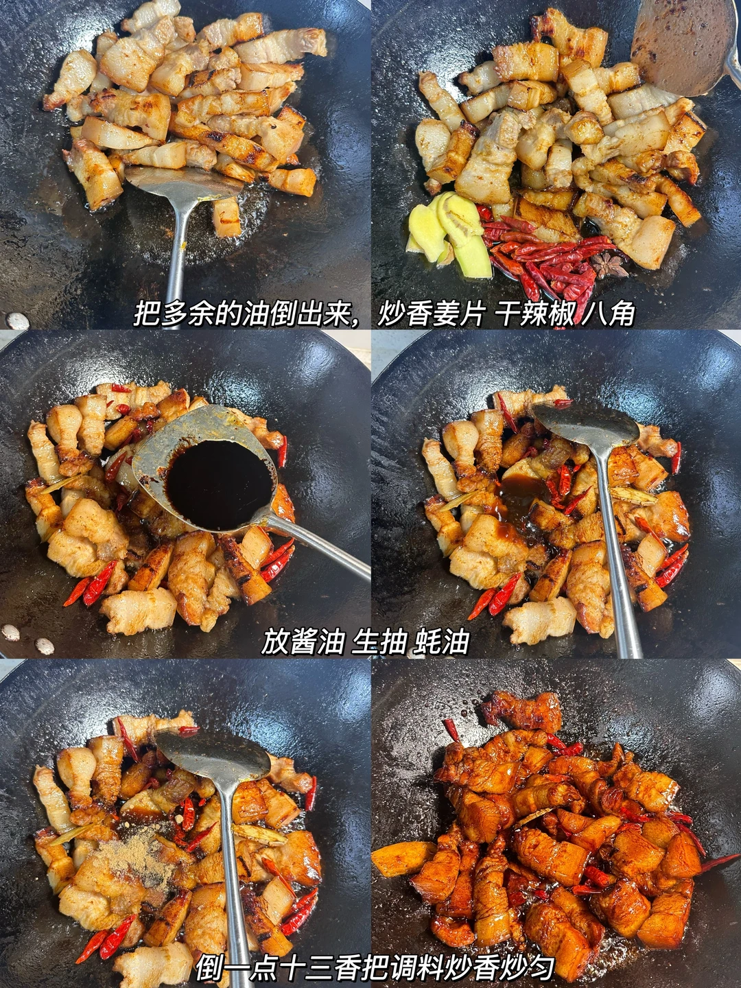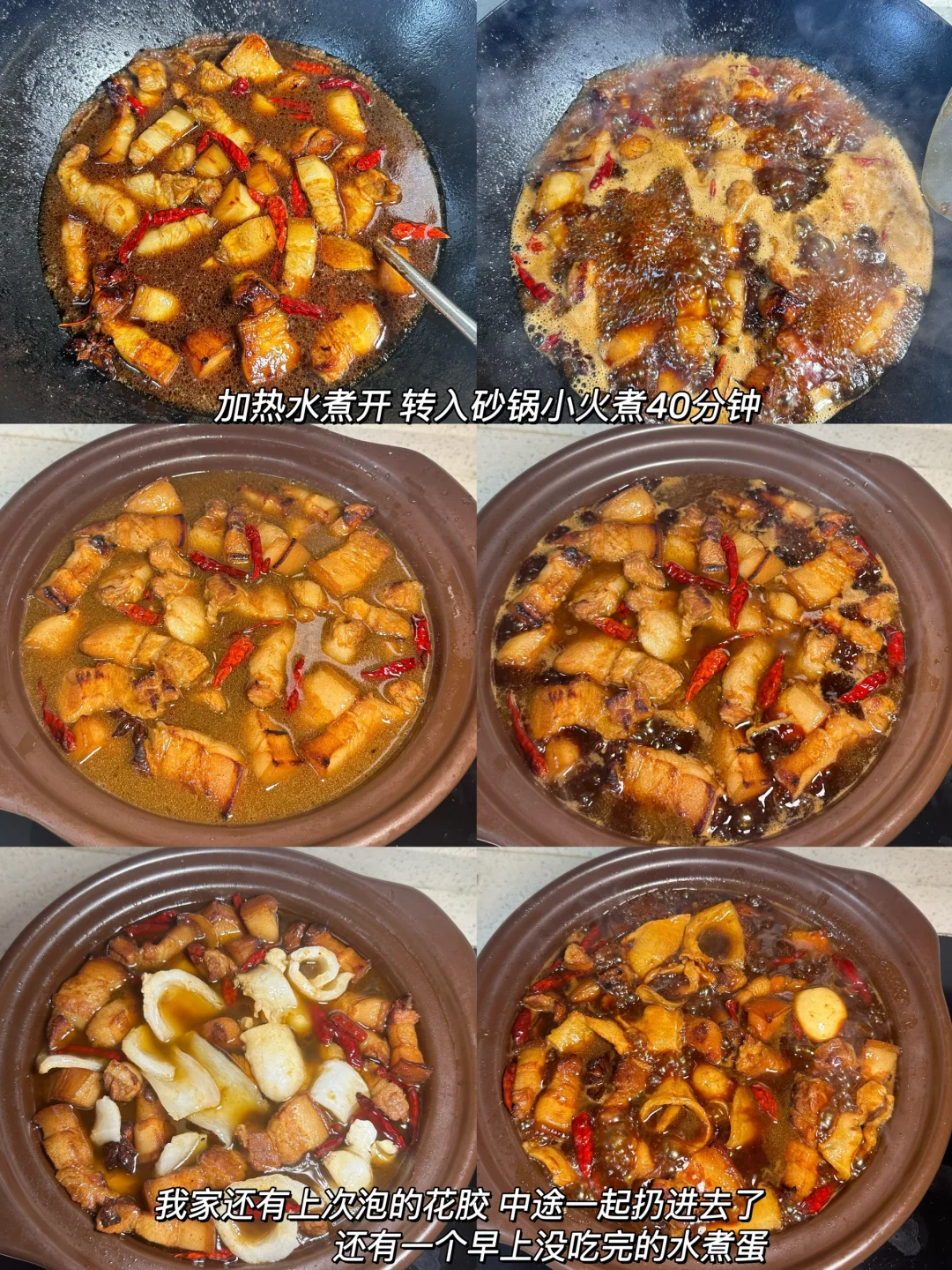 3️⃣:五花肉推到一边,放姜片 干辣椒 八角炒香。调味放一大勺酱油 生抽 蚝油,倒点十三香粉炒香。加刚好盖过五花肉的热水大火煮开。转入砂锅中小火煮40分钟。中途记得开盖翻拌哦。再加点鸡精调味,起锅前撒一把葱花。 可以准备几个水煮蛋一起扔进去~很入味