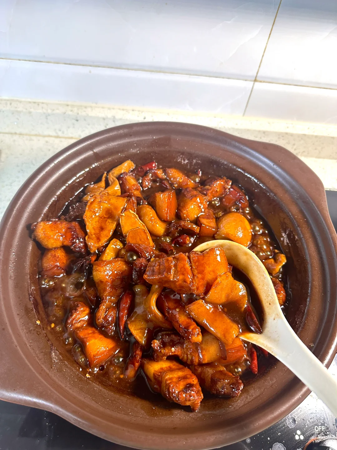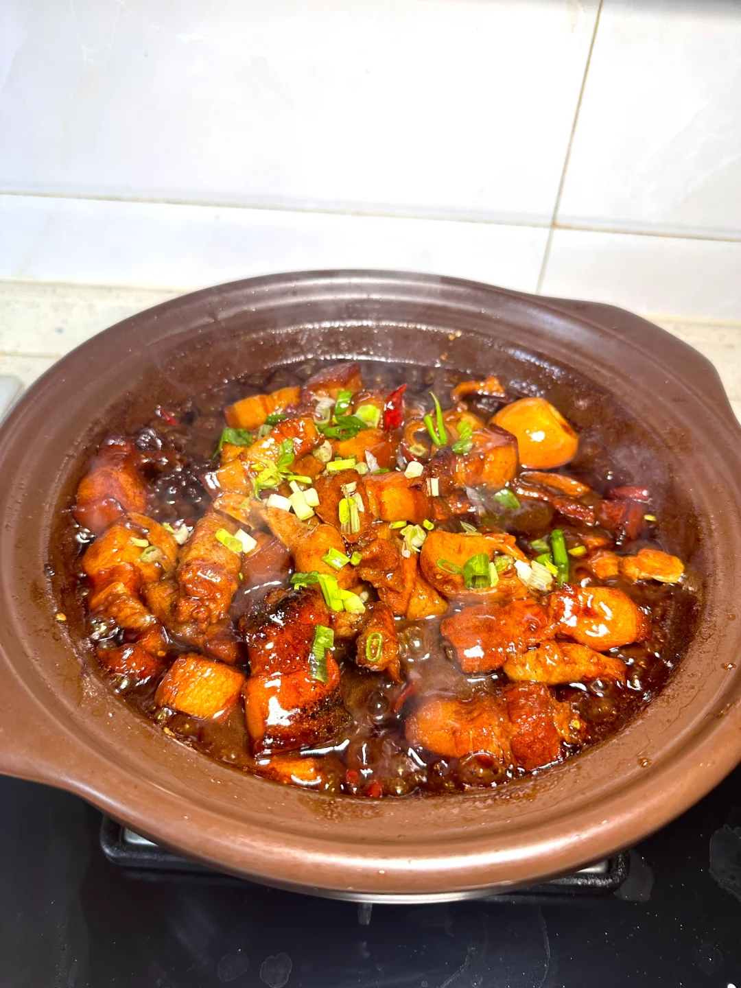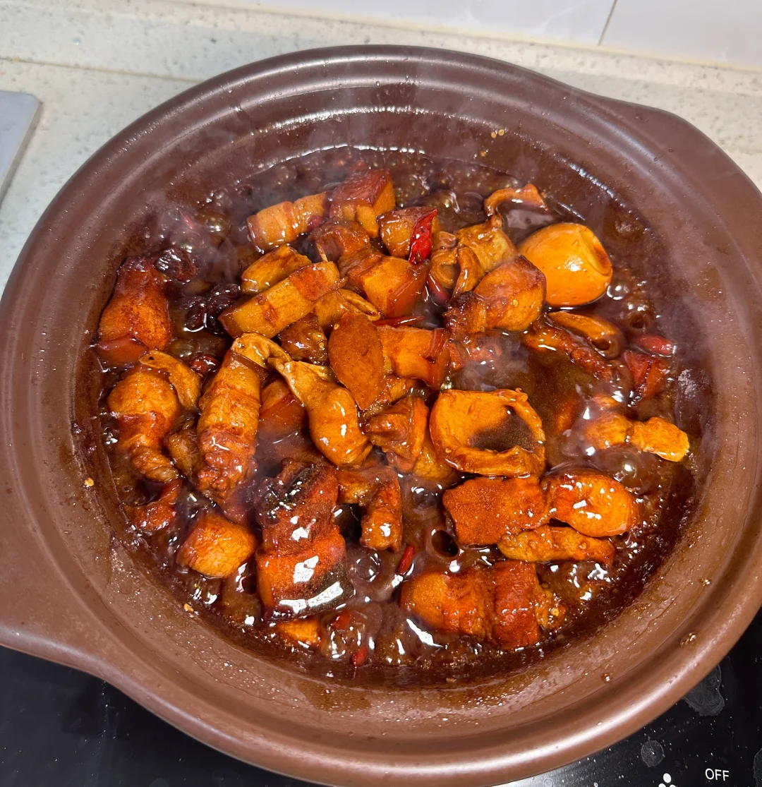 3️⃣:五花肉推到一边,放姜片 干辣椒 八角炒香。调味放一大勺酱油 生抽 蚝油,倒点十三香粉炒香。加刚好盖过五花肉的热水大火煮开。转入砂锅中小火煮40分钟。中途记得开盖翻拌哦。再加点鸡精调味,起锅前撒一把葱花。 可以准备几个水煮蛋一起扔进去~很入味