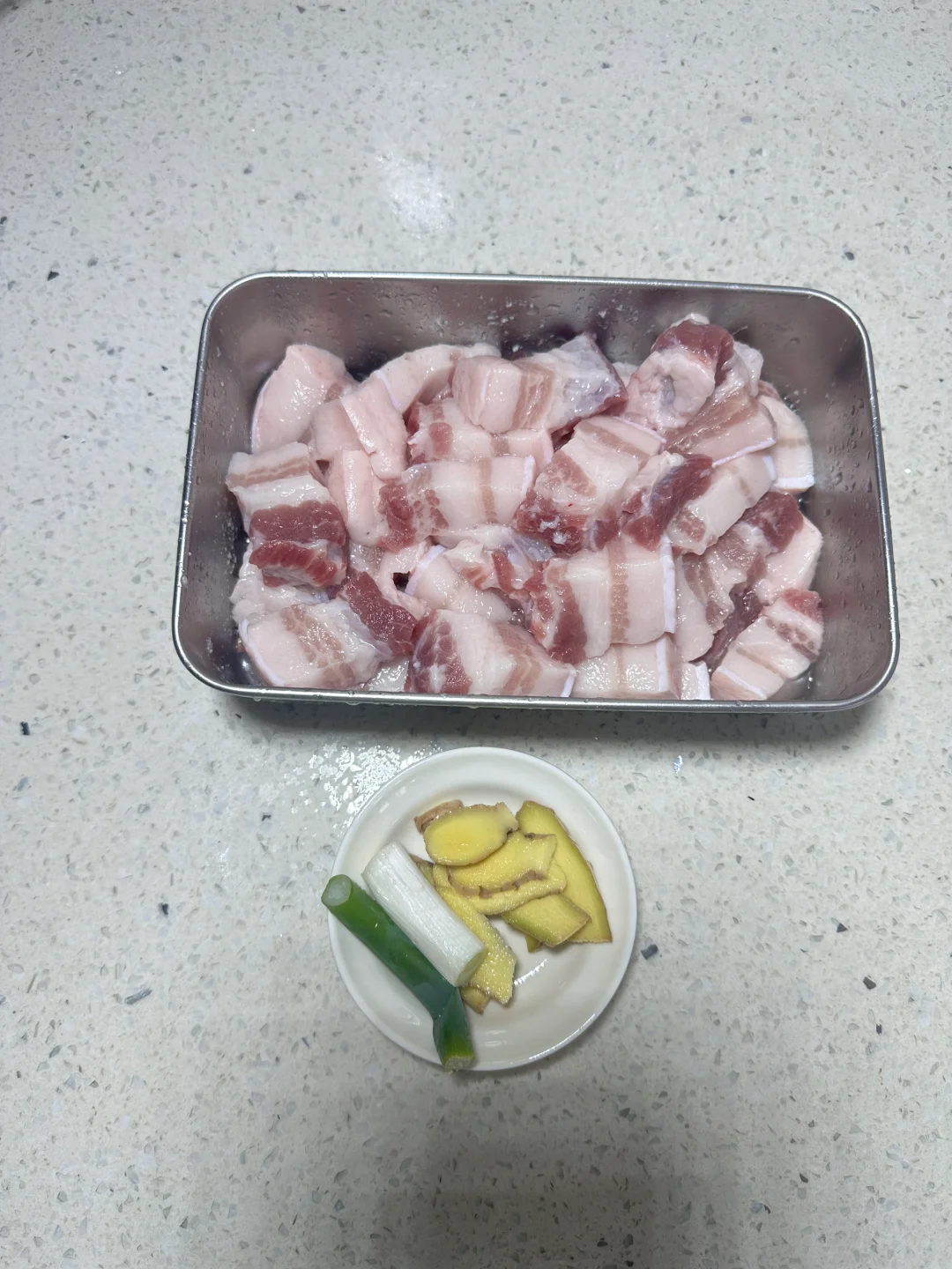 肉冷水下锅加 姜 🫚葱 焯水,水开后煮两分钟 不要关火 把五花肉夹出来擦干水份。