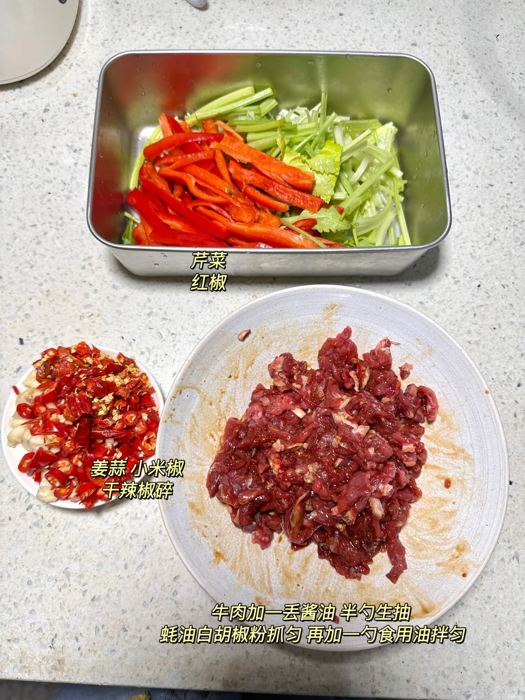 1️⃣:牛肉逆着纹路切薄片,加一点酱油 生抽,蚝油 白胡椒粉抓匀,再加食用油拌匀腌制10分钟入味(我买的吊龙那一块,如果买的部位不是特别嫩就加小半勺生粉哦)芹菜摘掉叶子切段,红椒切条(不重要 不放红椒也行)