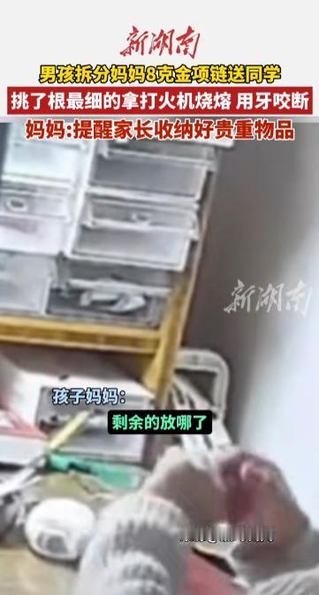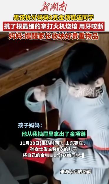 笑不活!山东,8岁男孩趁妈妈不在家,竟然偷偷打开妈妈的柜子,将妈妈近8克的金项链拿出,用打火机烧熔、用牙咬断,当作“金豆子”送给了同学,如今时隔一月,儿子既记不清分给了谁,也说不清剩余项链的去向,仅找回一小段!孩子妈妈:找回几率几乎为零,又气又好笑!   近日一位女士遇上件糟心事,下班回家翻找东西,意外发现自己的结婚纪念金项链不见了,这条项链快八克重,不光值钱,更是当年她和老公互相送的礼物,意义不一般。   她把家里翻了个遍,也没找着剩下的部分,问来问去才知道,是八岁的儿子趁她不在家,悄悄打开衣柜拿的。   等妈妈把孩子叫到跟前问清楚,孩子说的理由又稚嫩又直接,看着项链闪闪的,想把 “真金” 变成能分给同学的 “宝贝”。   令人意想不到的是,孩子找来打火机,把项链好几处加热软化,接着用牙齿一段段咬断,弄成了好多不规则的小球、小碎片,还自己给这些东西起名叫 “金豆子”,之后他把这些 “金豆子” 分给了好几个同学,说是当玩具,还能用来交换礼物。   可问起具体分给了谁,剩下的碎片在哪儿,孩子根本说不清楚,只模糊记得 “给了几个同学”。妈妈赶紧联系了几个她知道的同学家长,最后也只追回来一小段残存的项链链节,其他碎片连影子都没找着。   她带着找回来的那点碎片去了珠宝店,店员说这些被弄变形、氧化,还可能夹着杂质的金片,想再加工不是不行,但损耗会很大,还要花不少工费。   看着眼前的情况,妈妈真是又气又好笑,气的是好好的纪念项链变成这样,再也回不到原来的样子,好笑的是孩子这想法太稚气,动机又透着股纯粹的天真。 这事传开后,邻里和网友都议论开了,有人说家长没把贵重物品看好,也有人觉得孩子好奇心强很正常,还有人提醒家长,得把值钱的东西收妥当,顺便教教孩子金属材质和金钱的概念。   其实这事儿也给所有家长提了个醒,家里的贵重物品一定要好好保管,孩子好奇心重是好事,但得在安全和规则的范围内引导,更重要的是,当孩子犯了错,光责骂没用,不如借着机会好好教育,让孩子懂什么是 “价值”,什么是 “后果”,该怎么 “负责”,比单纯说他两句印象深刻多了。 那条项链或许再也回不到最初的模样,但通过这件事,一条更重要的 “教育链”,会留在孩子心里慢慢发芽。 对此,你还有什么看法呢? (信息来源 :新湖南 )