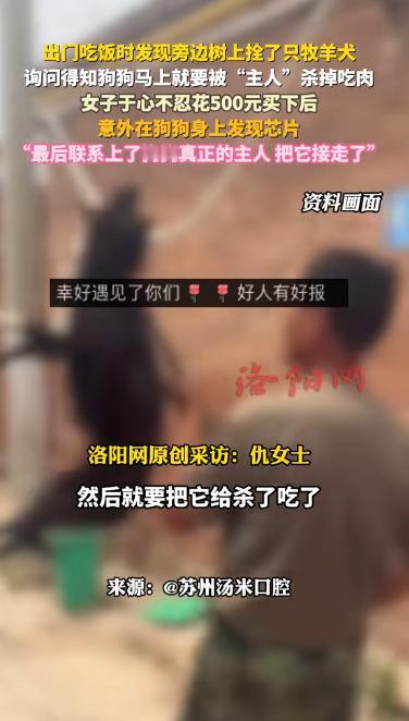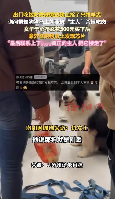 良心不会痛吗?11月25日,苏州一女子出门吃饭,竟然发现路边树上拴了一条牧羊犬,正可怜巴巴的望着她,女子询问后得知,狗狗马上就要被“主人”杀掉吃肉,女子于心不忍,花500元将其买下,并带它去宠物医院检查,结果,却在狗身上发现了芯片!   宠物医院里,医生拿着仪器刚扫过狗狗身体,突然 “嘀嘀” 响了两声,王女士(化名)凑过去一看,心里咯噔一下,这狗居然有芯片。     她当时还没缓过神来,前几个小时在路口看到这只牧羊犬时,它还被粗绳子拴在树上,毛乱得像打结的草,肚子瘪瘪的,只有眼睛亮得吓人,直勾勾盯着路过的人。   那天苏州夜里风挺凉,王女士在楼下的一家小馆子吃口饭,没走几步就停住了,看到一只狗狗十分的可怜,被绳子拴着没有一点自由。   随后王女士立马就问问这只狗是怎么回事,不料一边的一名中年男子说,这狗子他们不想养了,等一会干完活就杀了吃了,听到这儿的时候王女士满是震惊。   最后在两人的商量下,王女士花了五百元将这只狗狗买了下来,紧接着这王女士就带着狗狗来到了宠物医院,到宠物医院检查,医生说狗就是有点擦伤和脱水,不算太严重。   输液、驱虫、做检查,前前后后又花了 580 块,女士看着狗安安静静躺在那里,偶尔抬头看她一眼,觉得这钱花得值。   本来都打算联系寄养的地方了,哪想到芯片这事儿突然冒出来,医生把芯片里的信息调出来,有主人的名字和电话,王女士拿着手机琢磨了半天,还是拨了过去,怕万一弄错了。   电话那头沉默了几秒,接着就是一阵特别激动的声音,说就是他们家的狗狗,前几天跑丢了,找了这么多天还是没有找到。   没多大一会儿,狗主人就赶来了,一进诊室看见狗,直接就抱哭了,那狗也认人,尾巴摇得快飞起来,嘴里还呜呜叫着,主人听王女士说狗差点被卖去杀肉,脸都白了,一个劲儿道歉,说这几天家里人都没心思吃饭。   后来知道王女士花了 1080 块,主人当场就把钱转过来了,说啥都要让她收下。   王女士回家把这事儿发网上,没想到好多人评论,有人说她心善,要是没人管,这狗就没了,也有人说,还好有芯片,不然找不着主人。     不管怎么样这事儿挺暖的,没有争吵,也没有啥复杂的矛盾,狗救下来了,主人也找着了,就连网友的评论,大多也是在夸这份善意。   咱们身边的温暖,有时候就来自这种小事,可能就是有人停下脚步,多管了个 “闲事”,就能把一条生命从危险里拉出来,也能让一份牵挂有个好结局。 对此,你还有什么看法呢? (信息来源 :洛阳网 )