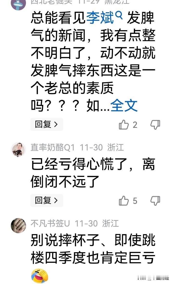 【CEO怒摔保温杯!】企业持续亏损,董事长坐不住了。 距离年初设定的今年目标,看来是难以达成了。第三季度依旧处于亏损状态,企业已经连续多年亏损了!明年新能源汽车的补贴和购置税推出,恐怕带来的电动汽车市场竞争将更加激烈了! 摔保温杯能解决问题吗?这样发泄情绪对企业经营真的有帮助吗?瞧瞧网友和投资者的评价,他们似乎并不认可这种做法啊! 汽车 三季报下降排行 公司经营困境 业绩困局 企业业绩下降