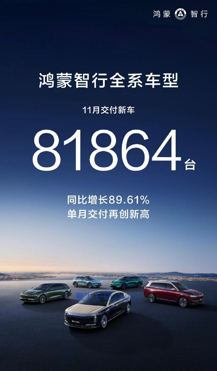 12月1日,鸿蒙智行公布全系车型11月交付新车81864台,同比增长89.61%,创单月交付历史新高。