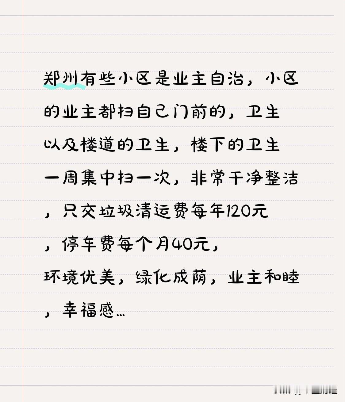 【没有物业费,只有垃圾清运费!】郑州有些小区是业主自治,小区的业主都扫自己门前的卫生以及楼道的卫生,楼下的卫生一周集中扫一次,非常干净整洁,只交垃圾清运费每年120元,停车费每个月40元,环境优美,绿化成荫,业主和睦,幸福感满满!没有物业费!谁家的东西坏了,都去找五金交电综合服务中心,他们不仅快速修理,而且价格合理。