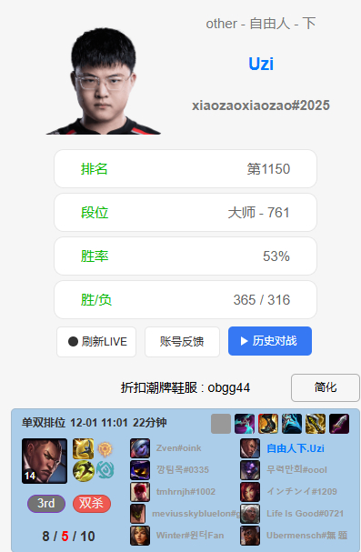瘾大无需多言!时隔五天Uzi再次登上韩服帐号Rank,卢锡安赢下后,又开了一把薇