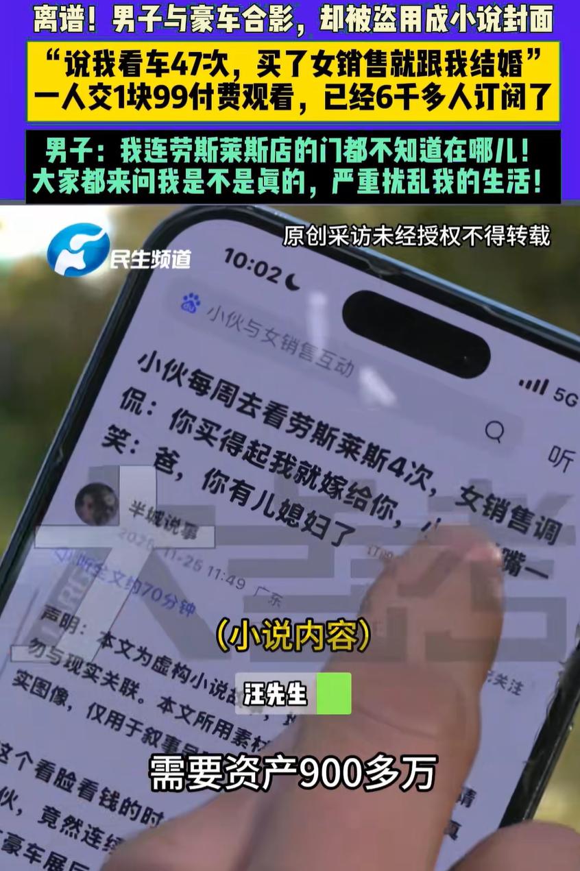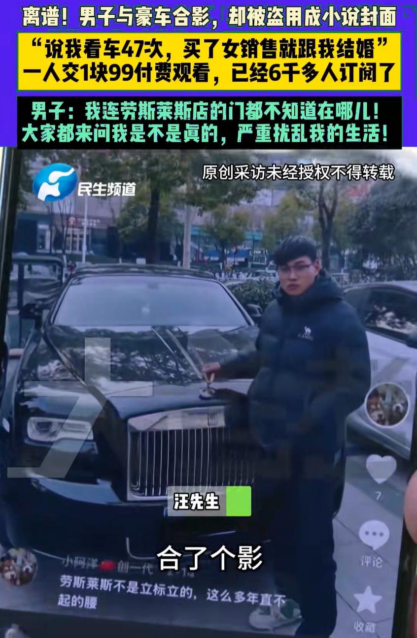 离了大谱!河南许昌,男子突然被朋友询问,是不是为了和女销售买劳斯莱斯了,男子听得一愣一愣的,还以为朋友是在开玩笑,后来一问才知道,自己的照片竟然被别人盗用成小说封面,而且付费内容相当奇葩,这严重的扰乱了他的生活,男子:把我卖了我也买不起啊! 汪先生介绍,那张照片其实挺简单,就是和朋友的劳斯莱斯合了张影。车不是他的,他也买不起,就是觉得好看,顺手拍了一张留个纪念。可没想到,照片被两个写小说的作者盯上了,直接拿来当成了故事封面 那故事内容也离谱。说是一个月薪四千的小伙子,每周去看劳斯莱斯四次,前后看了四十七次,女销售开玩笑说你要是买了这车我就嫁给你。结果小伙小嘴一歪,掏出手机:爸,你有儿媳妇了 更让人哭笑不得的是,这故事还是付费阅读,看到关键处得花一块九毛九解锁,居然已经有六千多人付了钱 就因为这样,汪先生的生活被打乱了。不少朋友真以为故事里那个幻想一夜逆袭、靠爹买豪车娶销售的人就是他,弄得他哭笑不得,只能一遍遍解释:把我卖了我也买不起劳斯莱斯啊 无奈之下,汪先生只能举报,同时把这个事反映给媒体,希望作者看到后能主动联系他 有网友说:他这应该是把照片发到公共平台上面了 这话说的没错,他如果没发到网上,也不会被人盗用,可问题是,发自己的照片到网上,本来不是什么错,错的是那些不经允许就拿去商用、还编出离谱故事的人 要知道,普通人的肖像权和名誉权也是权利,不是因为你不是公众人物就能被随便用。现在的内容平台,各种自动推荐、流量冲击,让一些创作者为了省事,直接拿别人照片就开写 他们觉得无所谓,可对当事人来说,生活节奏被打乱,解释不完的误会堆在那,谁碰上都得头大