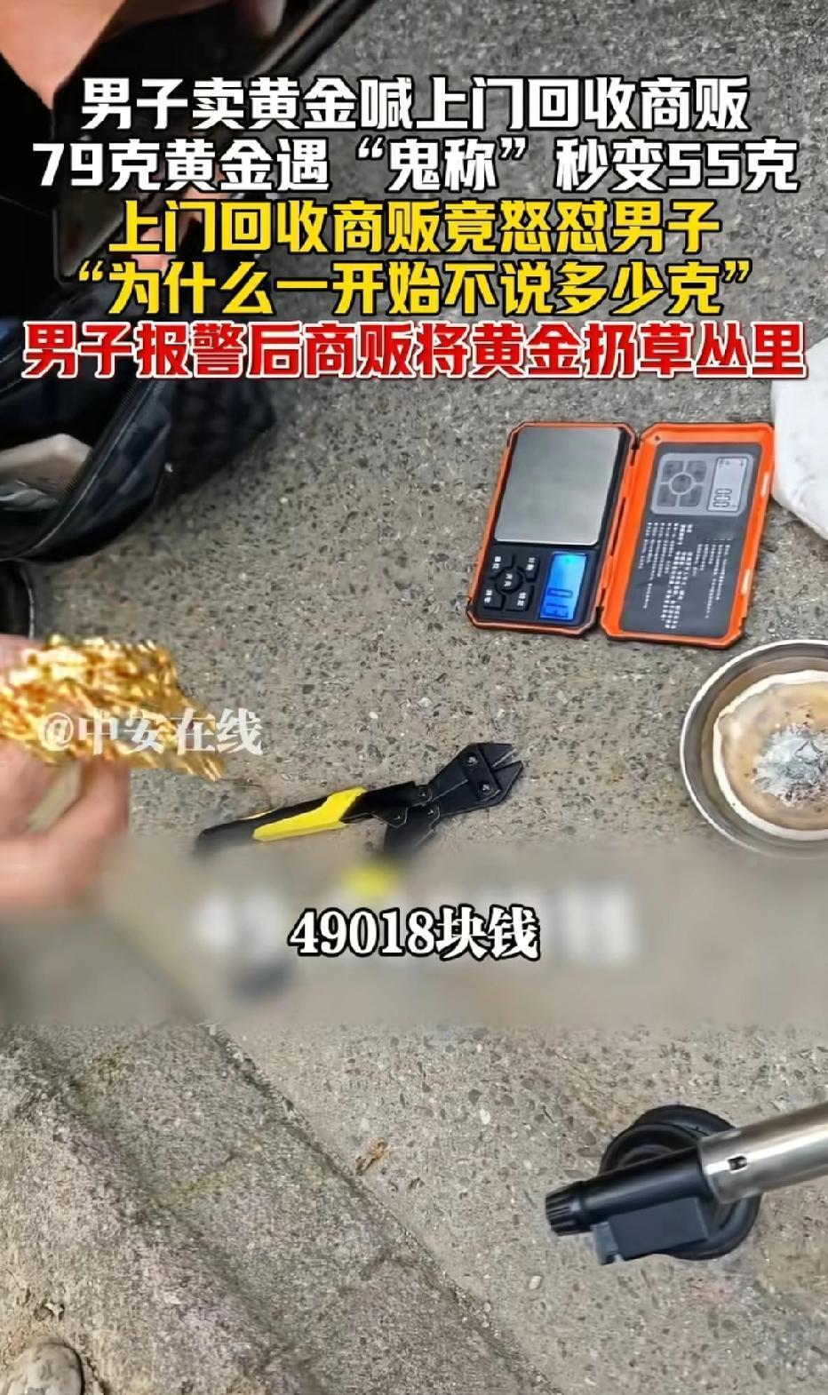上海,男子家里有79克黄金,喊人上门回收时,谁知,称出来才有55.45克。男子懵了,少了24克,直接给49018元给男子,男子发现少了2万多,他当场亮证据质疑克数和钱款,不料,商贩竟怒怼:你为什么不说多少克。说完就想跑,男子直接报警。 男子最近急需用钱,他知道家里有79克黄金,没办法的情况下,只能拿去卖了。 男子为了谨慎起见,他自己在家已经将黄金称了一遍。 事后,男子很庆幸自己的举动,为他保全了财产。 男子不知道在哪里看到一个上门回收黄金的广告,就打电话过去。 商贩很快来到男子住的楼下。 商贩以920每克卖给男子,男子对此没有异议。 男子把黄金交给商贩称,谁知,称出来是55.45克。 商贩利落报出了一个数:49018块钱,好像怕男子反悔似的,直接就转账给男子了。 男子立马就拿出实际克数质疑商贩,我的黄金就是79克,你为啥少我24克,还少我2万多块钱。 商贩这下慌了,加上他心虚,他的称确实是鬼称。 遥控器一按两下,就可以神不知鬼不觉地把克数降下来。 面对男子不依不饶质问,商贩竟然恼羞成怒,直接怒怼:你为啥一开始不说克数。 男子听了,感觉商贩好搞笑,自己没诚信,还怪别人。 男子也理直气壮反驳:我为什么要说呢,你为什么要坑人呢,你可以不坑的呀! 他让商贩把黄金再放上去重新称,但商贩怕露馅,死活不肯。 男子可不惯着商贩,向过路的人揭露他假称。 79克黄金,秒变55克,要是他不提前称,一下子坑他2万多块钱,对方真的好赚钱呀,可是自己就亏大了。 人家商贩交易完,就直接开车走人,自己找不到人,上哪说理去。 商贩眼看吵不赢对方,又担心事情败露,只得乖乖把钱补给对方,然后想逃之夭夭。 男子早就看穿了他的意图,直接报警,他觉得这件事必须有个说法,不能让商贩再去忽悠别人。 男子提前称重留存证据的行为,堪称维权典范,多一分谨慎,少一分损失。 男子果断报警、坚持曝光商贩欺诈行为,绝非小题大做,而是最正确的选择。 面对不法商贩的恶意欺诈,沉默只会纵容其继续坑蒙拐骗,让更多人沦为受害者。 唯有主动维权、公开曝光,才能让"鬼称"骗局无所遁形,让失信者付出应有的代价。 大家对恶行的纵容,就是对善良的伤害。 如果男子因商贩补了差价就选择息事宁人,商贩大概率会换个目标继续行骗,更多人会遭遇类似损失。 现在上门回收,假称的确存在很多猫腻,让人防不胜防。有些商贩用缺斤少两的称,虽然看似一时得利。 但偷来的差价终会还回去,丢了的信任再也找不回,做生意如同做人,诚信靠谱才是唯一的通行证。 《民法典》第7条规定:民事主体从事民事活动,应当遵循诚信原则,秉持诚实,恪守承诺。 商贩用“鬼称”篡改克数,明显违背此原则,其交易行为缺乏诚信基础。 《消费者权益保护法》第55条规定:经营者提供商品或服务有欺诈行为的,需按消费者要求增加赔偿损失,增加赔偿金额为消费费用的三倍;若该金额不足五百元,则按五百元计算,这是商贩需承担的惩罚性赔偿依据。 商贩需向男子补足2万多元的黄金差价,还得承担惩罚性赔偿,赔偿金额为此次交易费用的三倍,若该金额不足五百元则按五百元计算。 同时,市场监管部门会没收商贩的作弊遥控器、“鬼称”等计量器具和违法所得,还可对其处以2000元以下罚款。 若查实他还有其他同类违法交易记录,还可能被处3万元以下的罚款,以此严厉惩处其计量作弊行为。 对此,你怎么看?