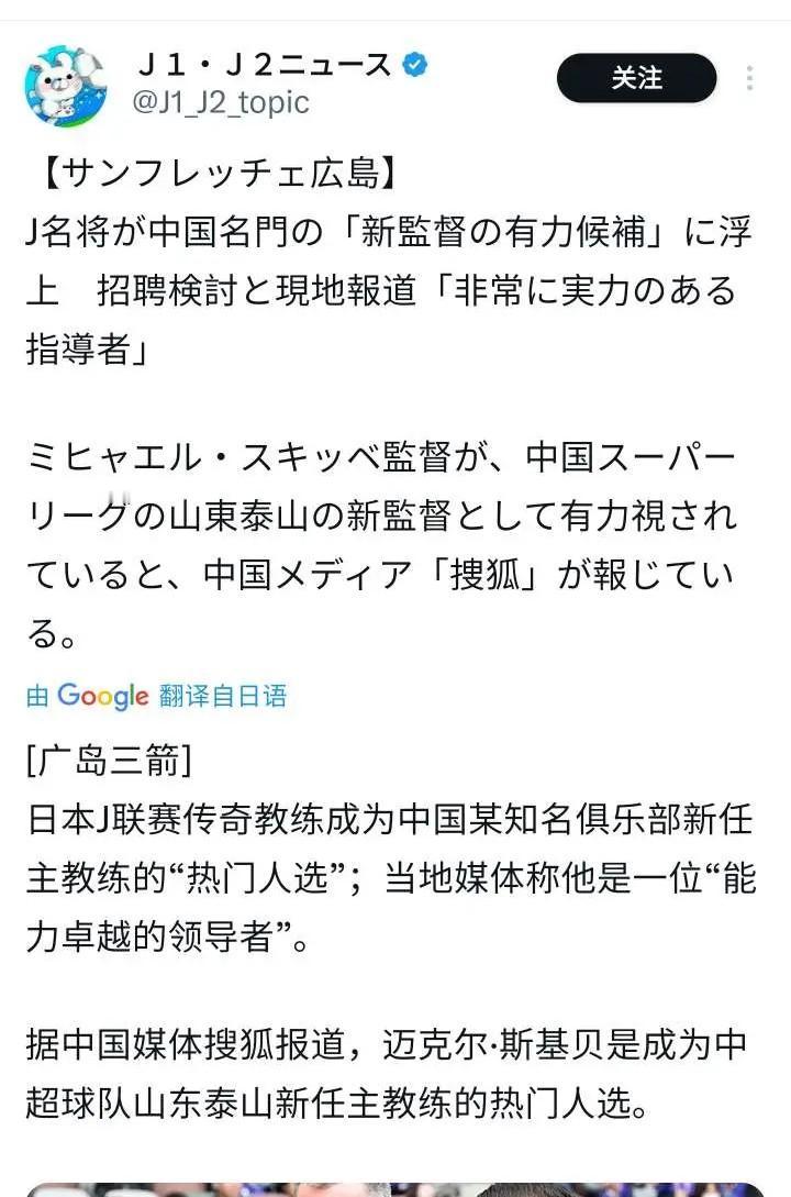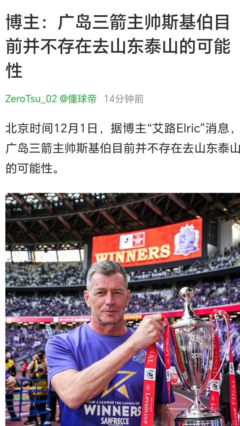 广岛三箭主帅斯基伯将执教山东泰山队?知名足球博主“艾路Elric”辟谣:广岛三箭主帅斯基伯目前并不存在去山东泰山的可能性。该博主常年关注日本足球联赛。 有媒体报道,甚至日本媒体报道,斯基伯将执教中超山东泰山队,不过这个消息可能从中国网站传出的。“媒体消息出口转内销”已经屡见不鲜。 赛季刚刚结束,关于引援的消息,现在爆料出来的,一般都不会太靠谱。 山东泰山队