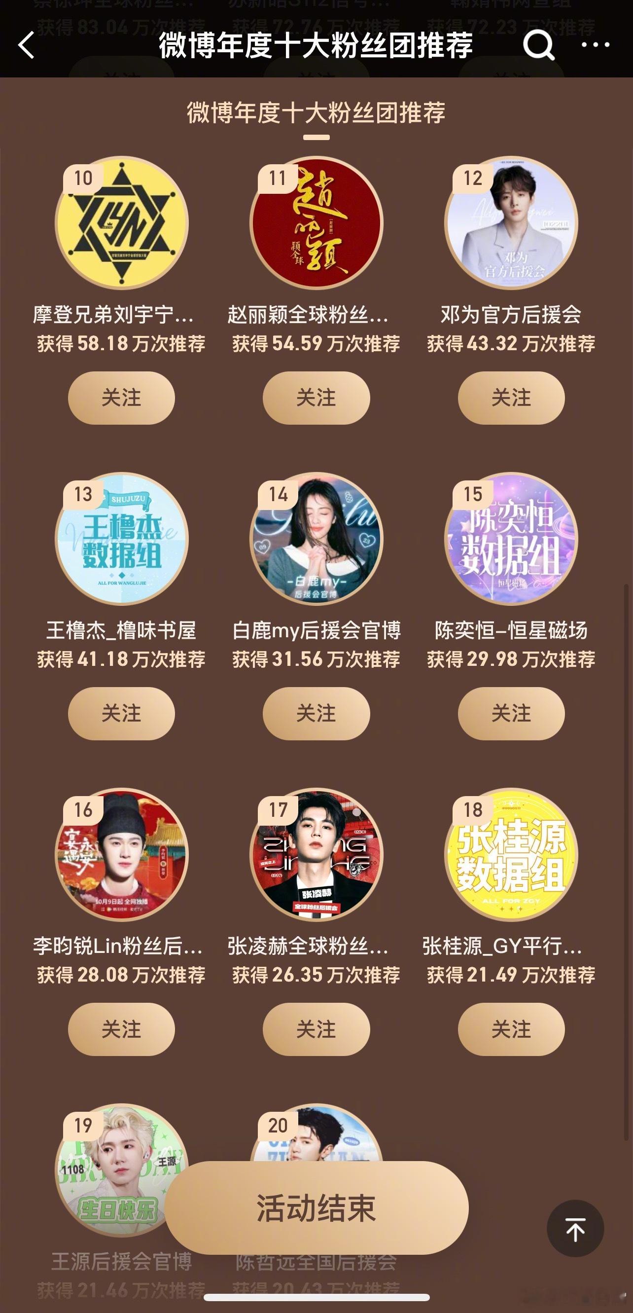 微博年度十大粉丝团第一名第二名梓渝,第三名檀健次四到十:鹿晗、魏大勋、杨紫、蔡徐坤、苏新皓、鞠婧祎、刘宇宁