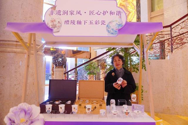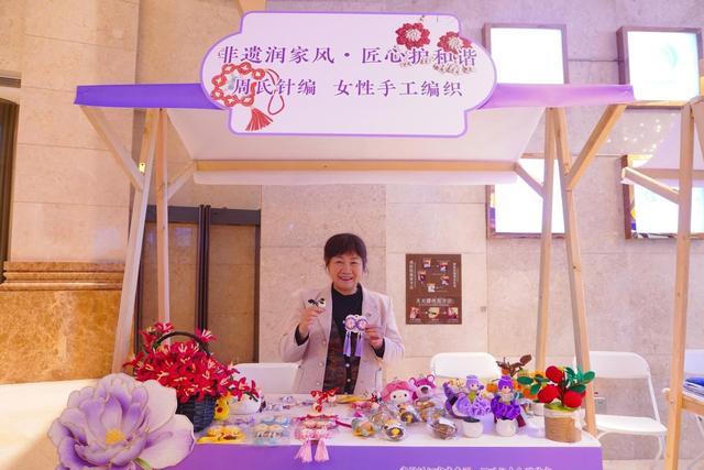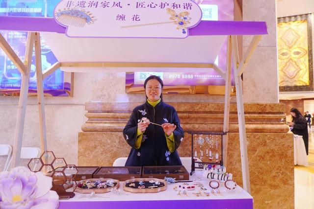 在展品陈列区,省女红协会会长、国家级非物质文化遗产项目湘绣代表性传承人、中国工艺美术大师江再红的湘绣绣品形神兼备,大气雅致尽显东方美学;省女红协会副会长、全国妇联执委肖跃莲带来的手工编织作品,以精巧结构呈现手工之美;省女红协会副会长、湖南海彣非遗馆馆长黄海文带来的土家织锦、滩头年画、浏阳夏布、侗锦等,纹样精美、色彩明快,承载湖湘对“家”的祝愿;省女红协会副会长陈妙华的手工编织中国结,绳线缠绕间寓意“团圆美满”;全国乡村工匠名师、省女红协会理事何湘陵的醴陵釉下五彩瓷,格调雅致、质感大气;邵阳职业技术学院艺术创意学院教师肖小芳的缠花饰品,配色清雅、寓意美好。此外,现场还展出邵阳蓝印花布等国家级非遗产品、宁乡四小碟等湖南老字号产品。
