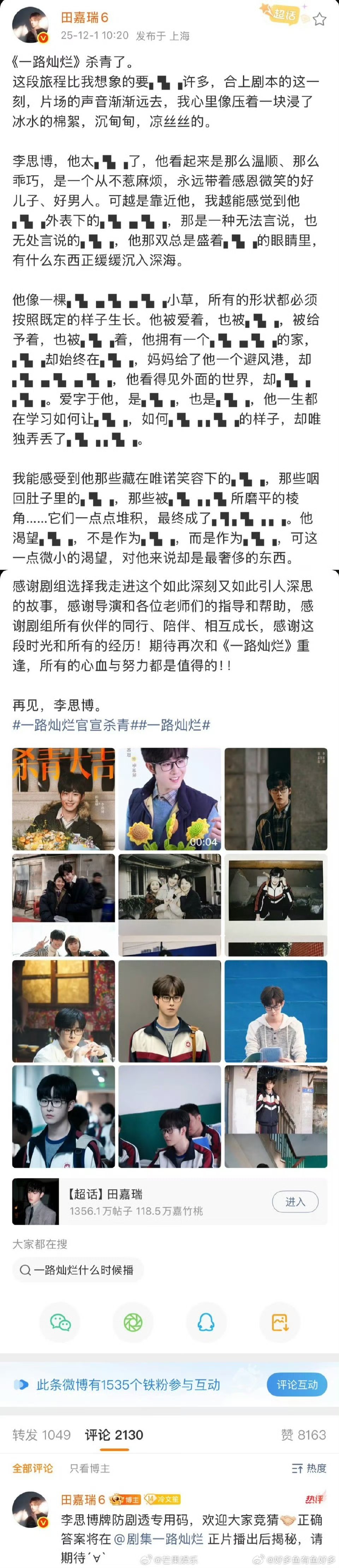 田嘉瑞给杀青作文打码了 《一路灿烂》今日杀青!田嘉瑞发长文暂别李思博,手动打码关键词保持神秘,悬疑感直接拉满,到底李思博有怎样的故事?坐等剧集解锁~
