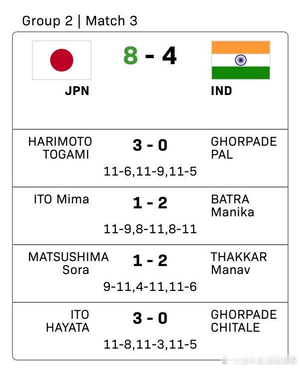 ITTF混合团体世界杯2025 251201 小组赛第二轮日本队 8:4 印度队张本美和/户上隼辅 3:0 印度选手伊藤美诚 1:2 巴特拉松岛辉空 1:2 塔卡伊藤美诚/早田希娜 3:0 印度选手日本队两战两胜暂列小组第1。