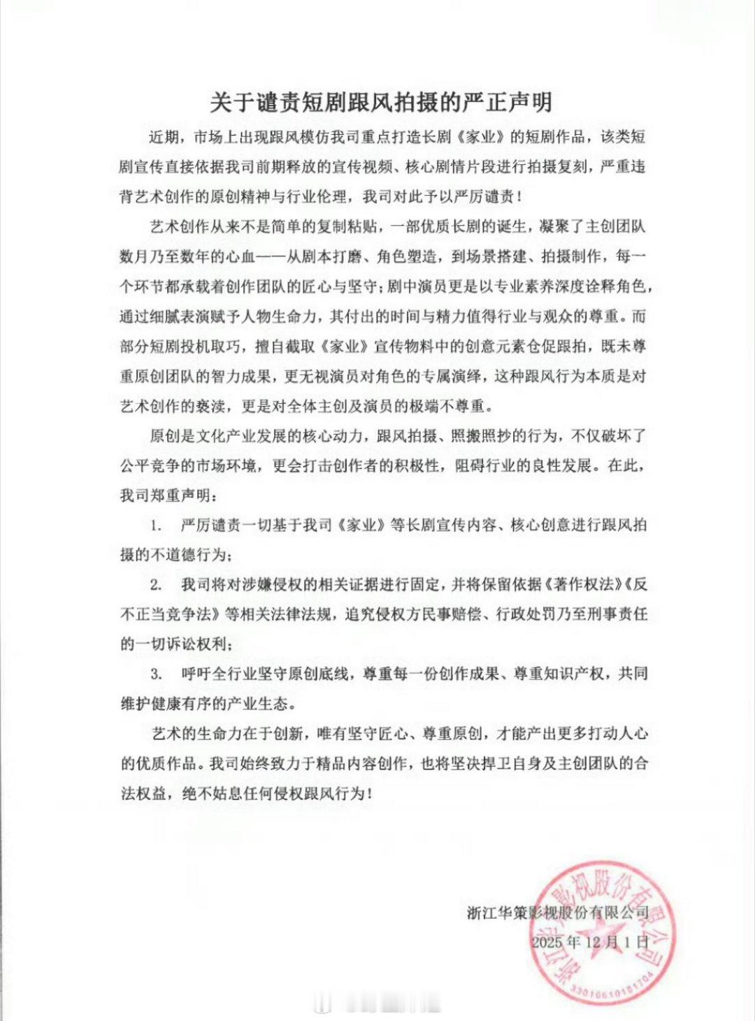 华策影视严正声明谴责抄袭《家业》的短剧 看来长短大战要开始了华策影视严正声明