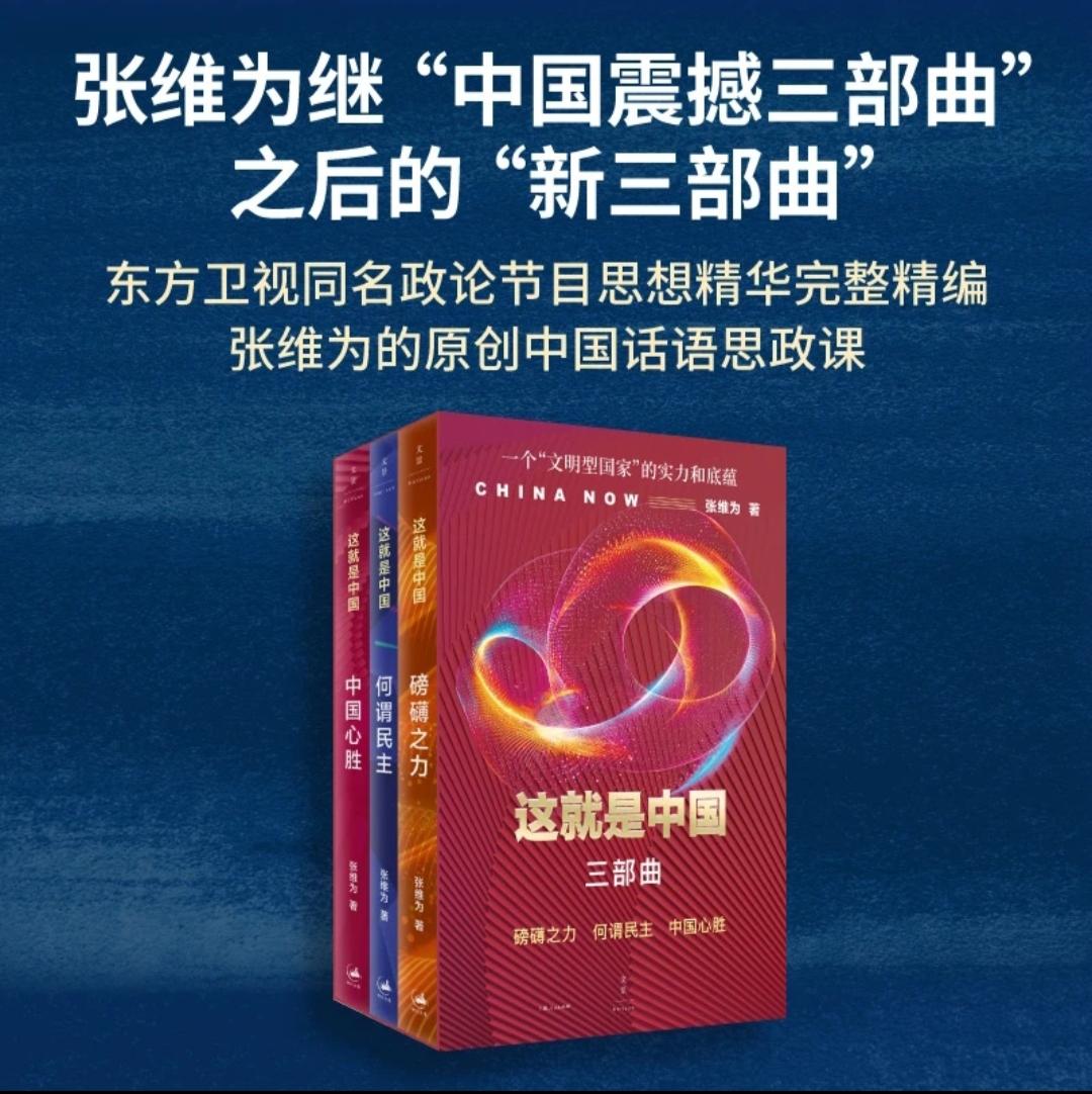 关于张维为教授新书发布的最新消息。 当年复旦大学张维为教授写了“震撼三部曲”三本书,引起热议。 有些张教授的粉丝急于知道张教授接下来要写什么书。来了,心心念念的书来了。这就是张教授隆重推出的新三部曲。每一本书的名字都有四个字,取得很有气势。 张教授对该系列书是这样介绍的:以国际眼光做原创研究,讲更靠谱的中国故事。