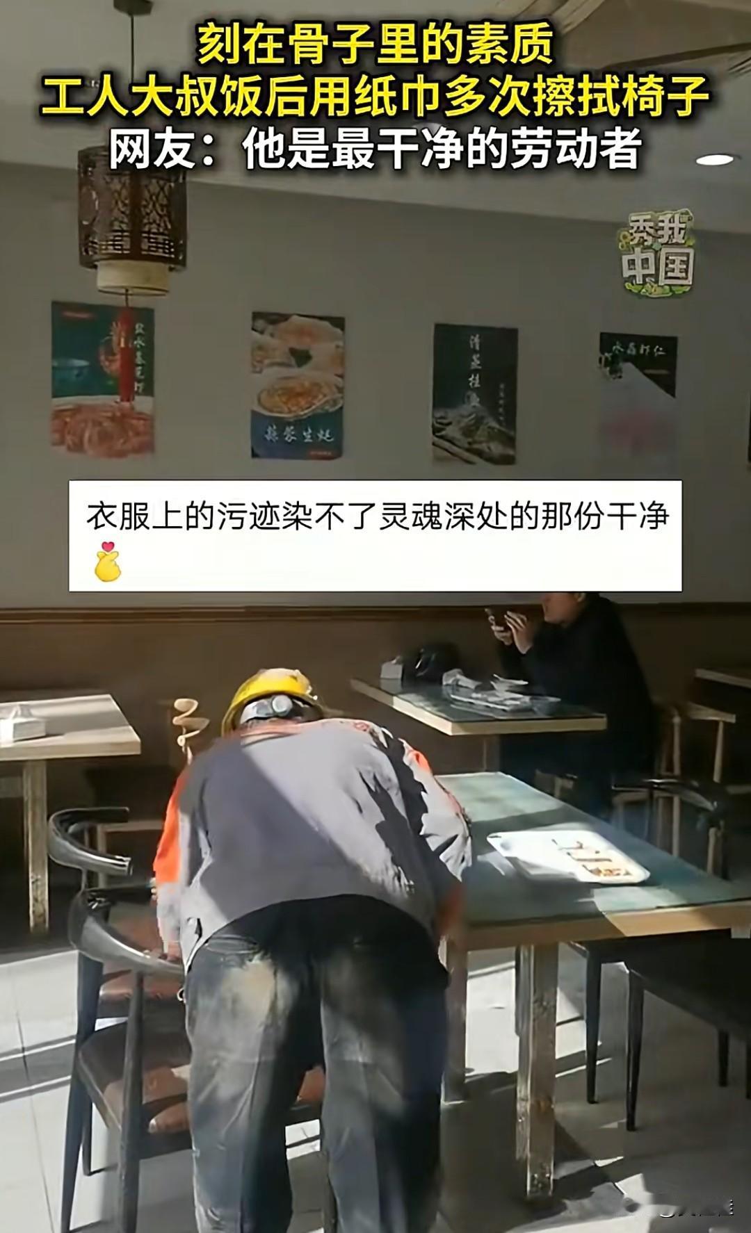这才是真干净!上海这位工人大叔,干完活吃饭,临走前站那儿拿纸巾把椅子擦了又擦。衣服上沾的灰是干活的痕迹,可心里的体面比啥都亮堂。 素质,其实就是替别人着想的那点自觉:怕自己坐过的椅子脏了,下一个人不好坐,顺手多擦两下。 衣服脏了能洗,心里的干净是刻在骨子里的。这大叔,比谁都“”讲究”!