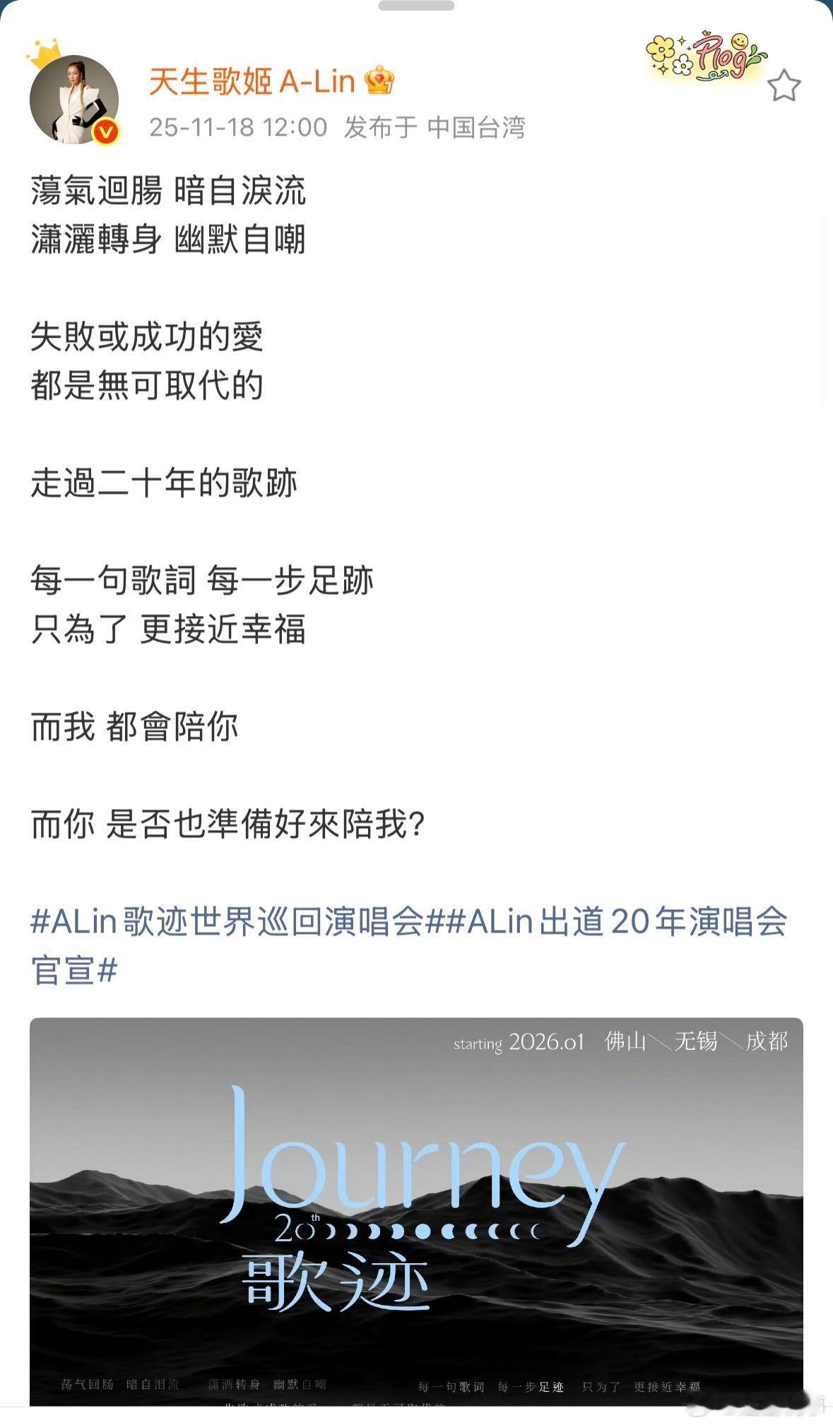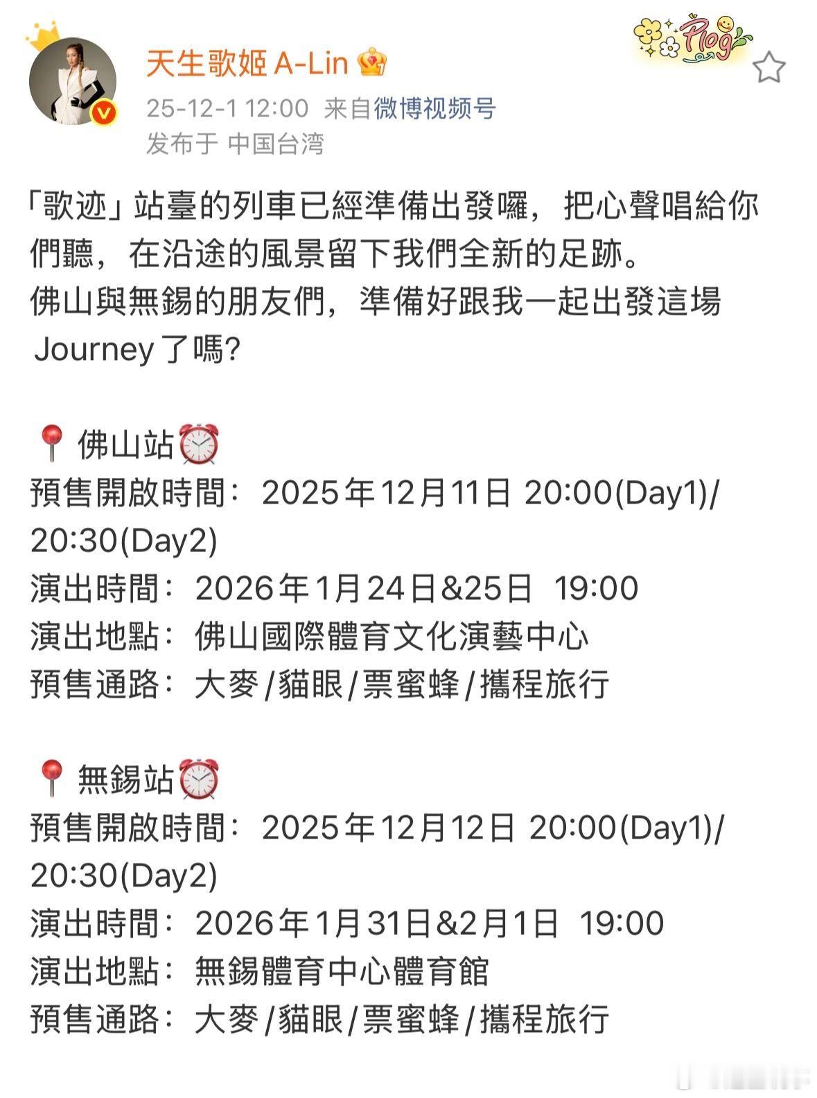 十二月第一个奇迹是ALin 谁的DNA动了!出道20周年的A-Lin带着「歌迹」巡演官宣,3场加佛山无锡双场的配置,直接戳中歌迷心巴!这位被称作「天生歌姬」的歌手,现场稳如CD,《给我一个理由忘记》《有一种悲伤》等金曲一开口就自带情绪感染力。已经和闺蜜约好12月11号、12号抢票,就等去阿冷的现场,让治愈声浪包裹整个冬天✨