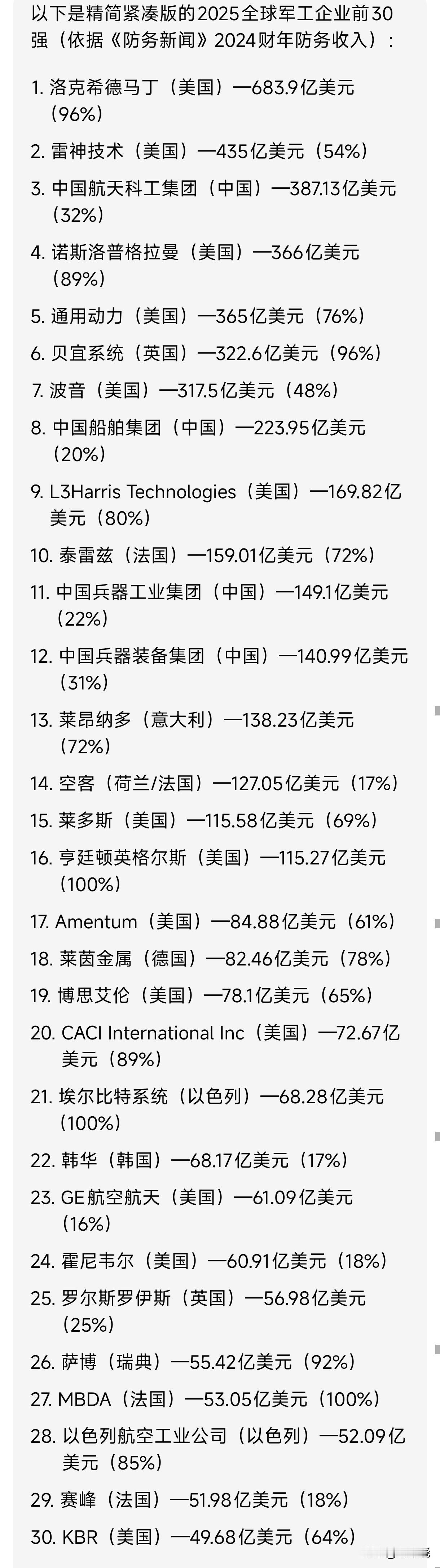 中国军工业营收下降10%;同期,日本大涨40%,德国增长36%,美国增长3.8%。全球百大军火商营收整体增长5.9%,达创纪录的6790亿美元。 斯德哥尔摩消息——据周一发布的一份报告显示,受乌克兰和加沙战事催生的需求以及各国不断增加的军费开支影响,全球最大武器生产公司去年的武器及军事销售总收入增长了5.9%。 斯德哥尔摩国际和平研究所(SIPRI)称,2024年,百家最大武器制造商的收入增至6790亿美元,这是该研究所有记录以来的最高值。 增长主要源于欧美公司,但全球范围内均有增长——唯有亚洲和大洋洲的中国军火工业出现轻微下滑。 前100名中有39家美国公司,其中30家——包括洛克希德·马丁公司、诺斯罗普·格鲁曼公司和通用动力公司——业绩实现增长。这两家公司总收入增长3.8%,达3340亿美元。不过SIPRI指出,“广泛的拖延和预算超支问题仍在困扰美国主导的主要项目的开发与生产”,其中包括F - 35战斗机项目。 除俄罗斯外的26家欧洲公司中,有23家因欧洲大陆增加军费支出,武器收入得以增长。在乌克兰战争和俄罗斯威胁的推动下,它们的总收入增长了13%,达到1510亿美元。 军工行业分析