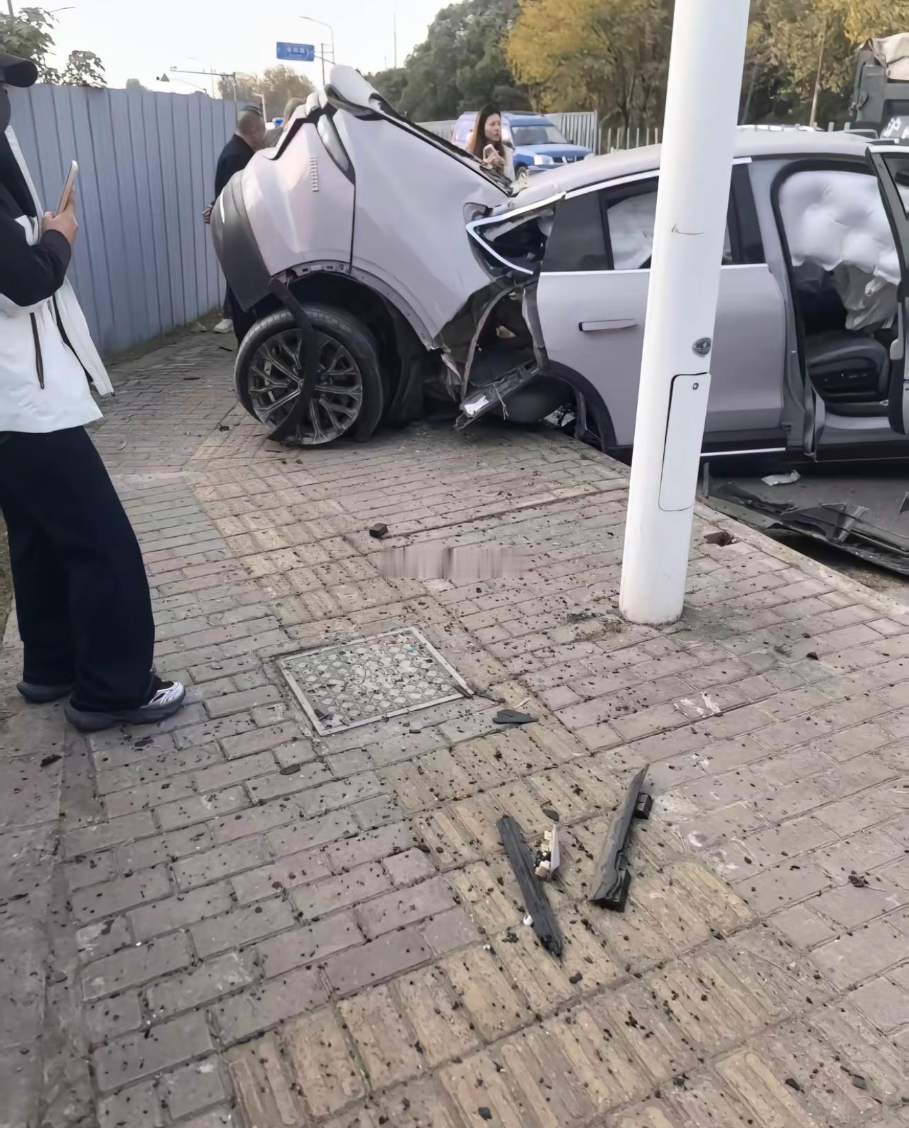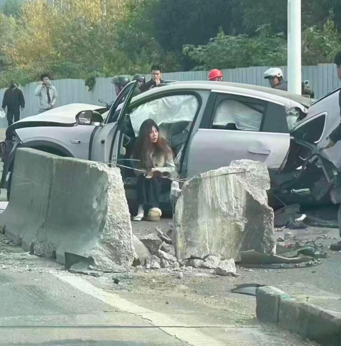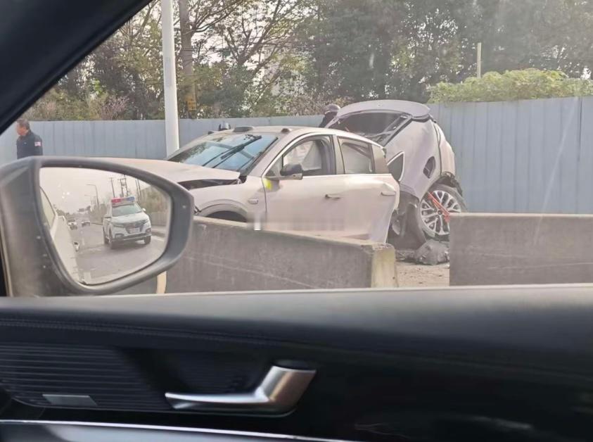 女子驾驶蔚来EC6车体撞上了石墩断成两截,还好车辆未起火,女司机人没事。