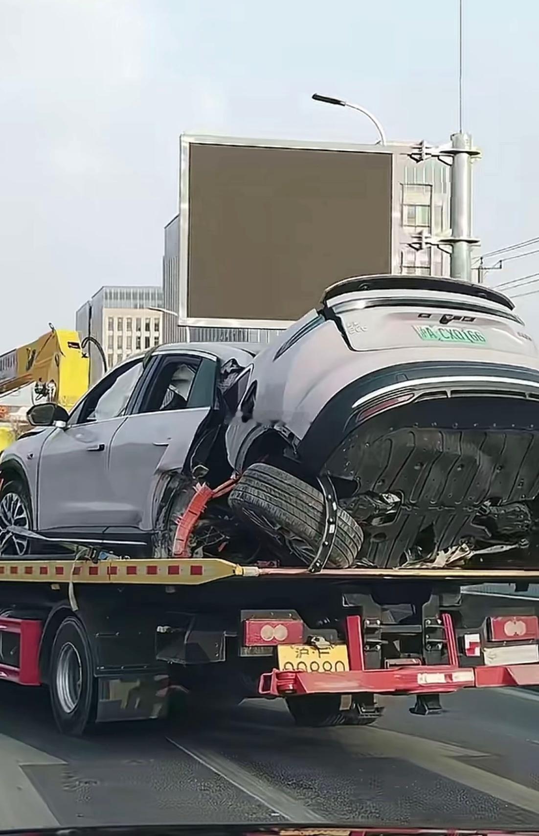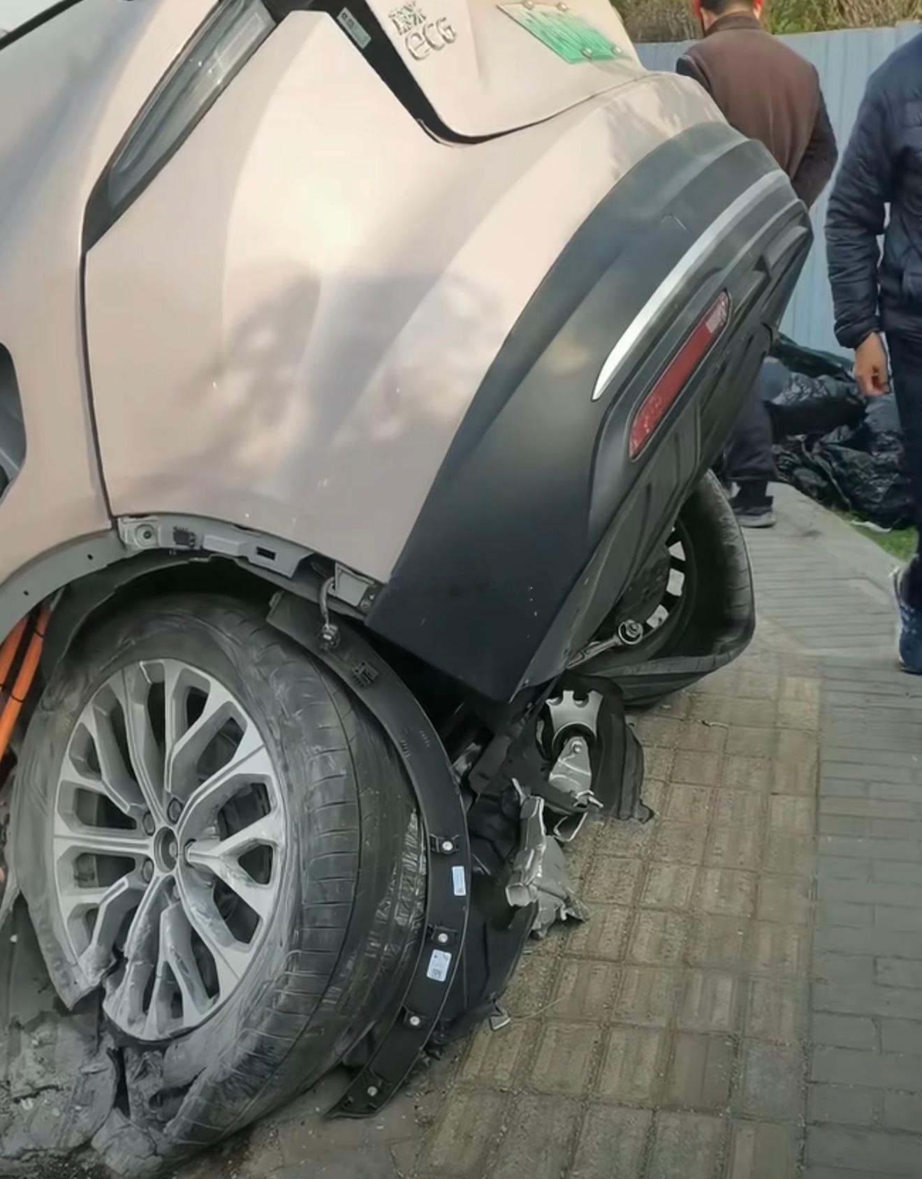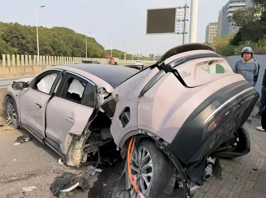 女子驾驶蔚来EC6车体撞上了石墩断成两截,还好车辆未起火,女司机人没事。