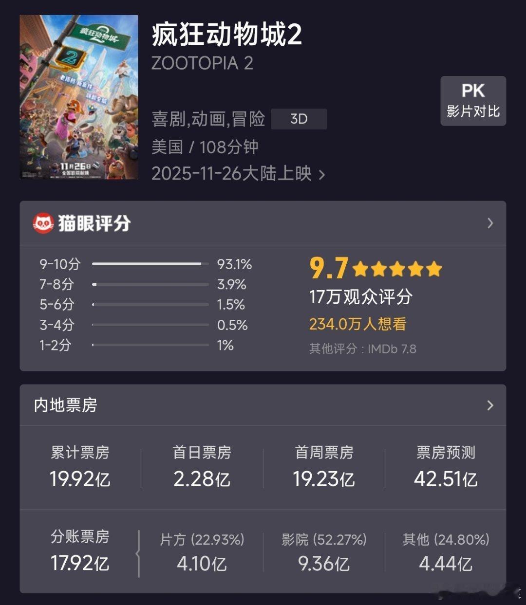 疯狂动物城2吸干大盘,照这个趋势,票房估计会破50亿元。