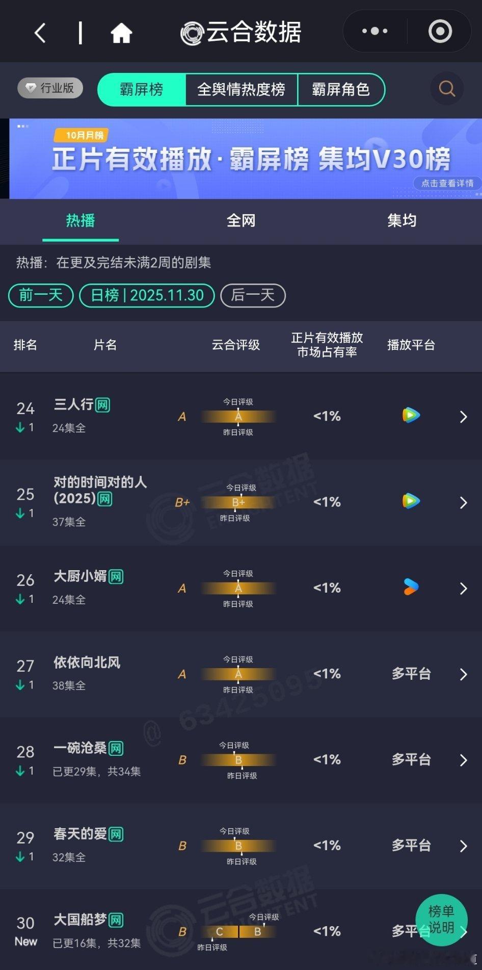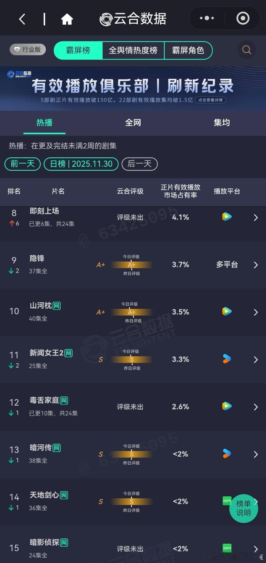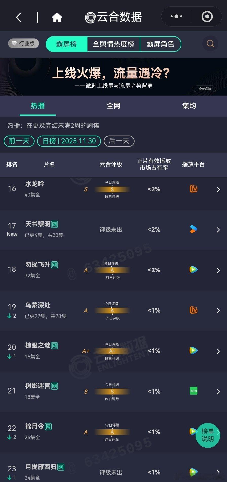 11月30日云合播放占比云合 唐朝诡事录之长安21.7%唐诡3长尾强得一匹 昨晚热度还创新高了。大生意人12.6%好消息,占比排名第二了,好剧要慢慢品,越品越有味。枭起青壤12.2%周末还是有效果的,评级大幅提升了。