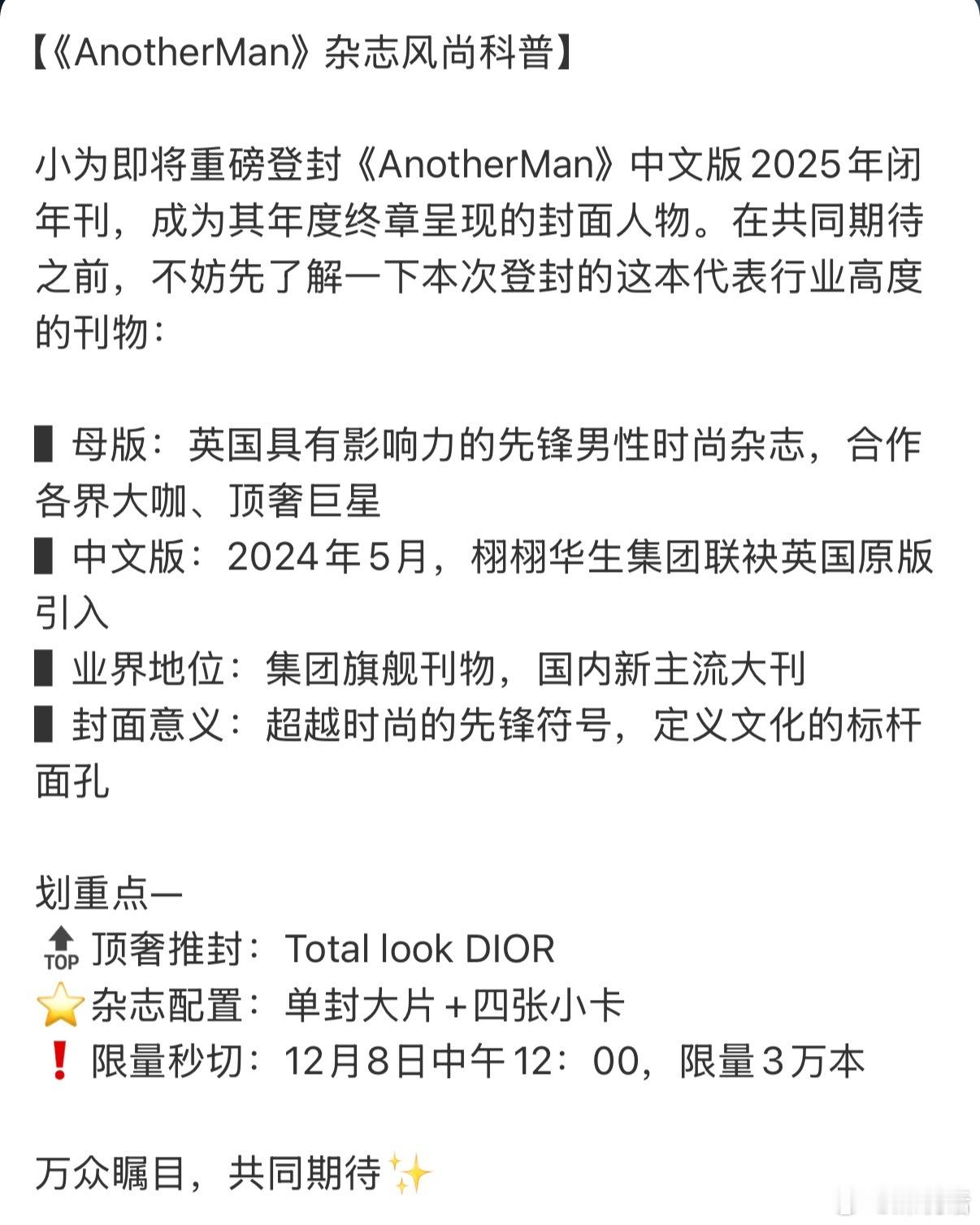 邓为将登著名男刊《AnotherMan中文版》12月闭年刊,由Dior奢牌推封,12月8日限量3w本 邓为anotherman中文版12月刊