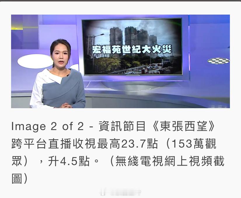 【明報即時】《東張》23.7點踞首位 《東華》收視近5年最高 吸124萬觀眾 無綫前晚播出的《善心滿東華》,共籌得1.18億元善款,全數撥入「大埔宏福苑事故愛心捐款」,最高收視19.1點(124萬觀眾),為近5年最高。(資料圖片)無綫公布上周(11月24日至11月30日)翡翠台收視,黃金時段收視全面上升。資訊節目《東張西望》跨平台直播收視最高23.7點(153萬觀眾),升4.5點,踞上周收視首位;處境劇《愛‧回家之開心速遞》最高收視17.8點(115萬觀眾),升0.5點;台慶劇《新聞女王²》最高收視20.5點(133萬觀眾),升1.4點;劉亦菲、李現主演外購劇《去有風的地方》最高收視15.5點(100萬觀眾),升0.3點;《帶阿姐看世界》最高收視12.5點(81萬觀眾),升0.3點;因應周三發生大埔宏福苑5級大火,涉及公眾關心重大事件,《晚間新聞》提早於10點半播映,最高收視15.3點(99萬觀眾),升3.1點。 周六晚《善心滿東華》全台動員過百歌手藝員,共籌得1.18億元善款,全數撥入「大埔宏福苑事故愛心捐款」,最高收視19.1點(124萬觀眾)近5年最高,升2.3點。周日晚車婉婉主持《中年好聲音4 決戰美加澳》,最高收視20.4點(132萬觀眾),升1.1點;陳貝兒主持《無窮之路V─智行無疆》首播,最高收視16.3點(105萬觀眾),升1點。 (即時娛樂)